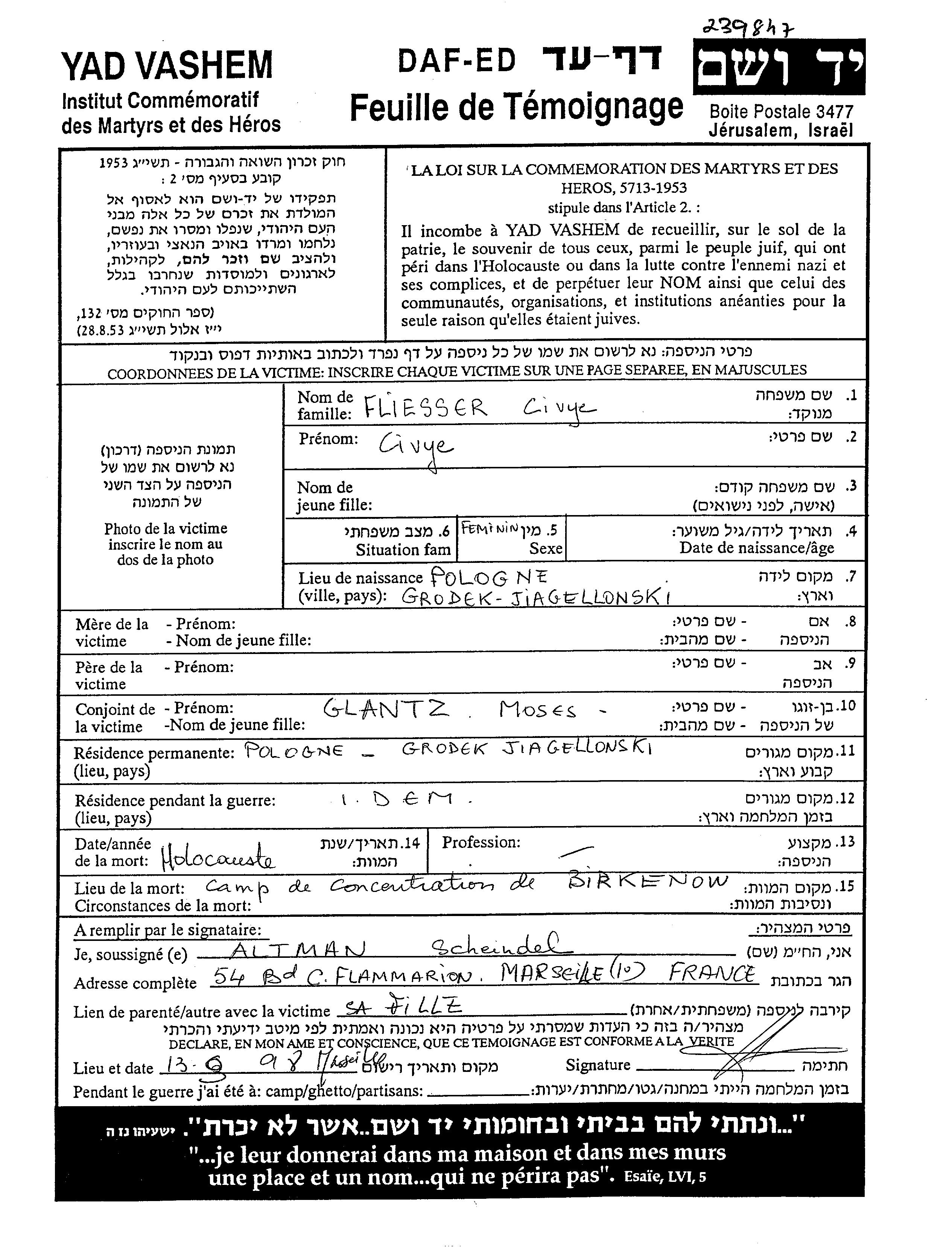 Цивье Флиссер Гланц, девичья фамилия Флиссер, место рождения: Грудек-Ягельоньски, Польша. Женат / замужем. Место жительства до войны: Грудек-Ягельоньски, Польша. Место во время войны: Грудек-Ягельоньски, Польша.