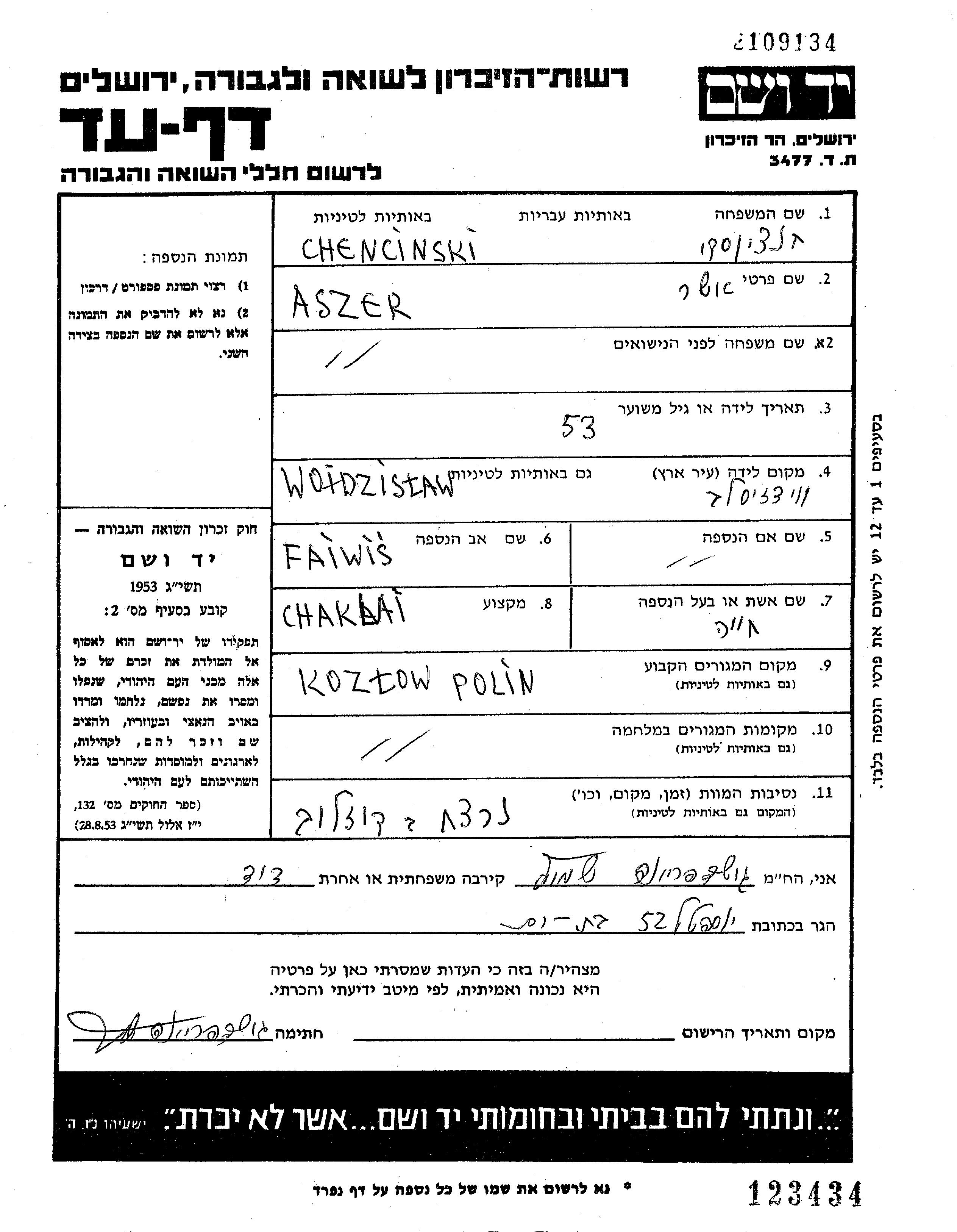 Ашер Хенчинский, место рождения: Водзислав, Польша. Отец: Фейбуш. Земледелец / земледелица. Женат / замужем. Место жительства до войны: Козлов, Польша. Место во время войны: Козлов, Польша.