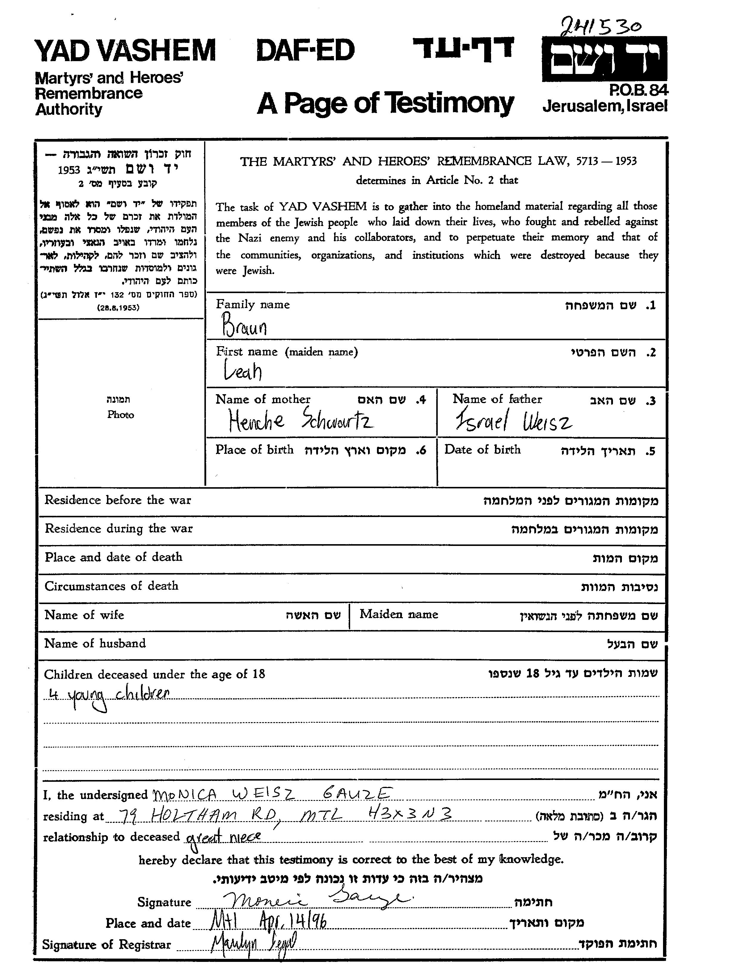 Лея Браун, девичья фамилия Вейс Исраэль Хенче девичья фамилия Шварц. Женат / замужем.