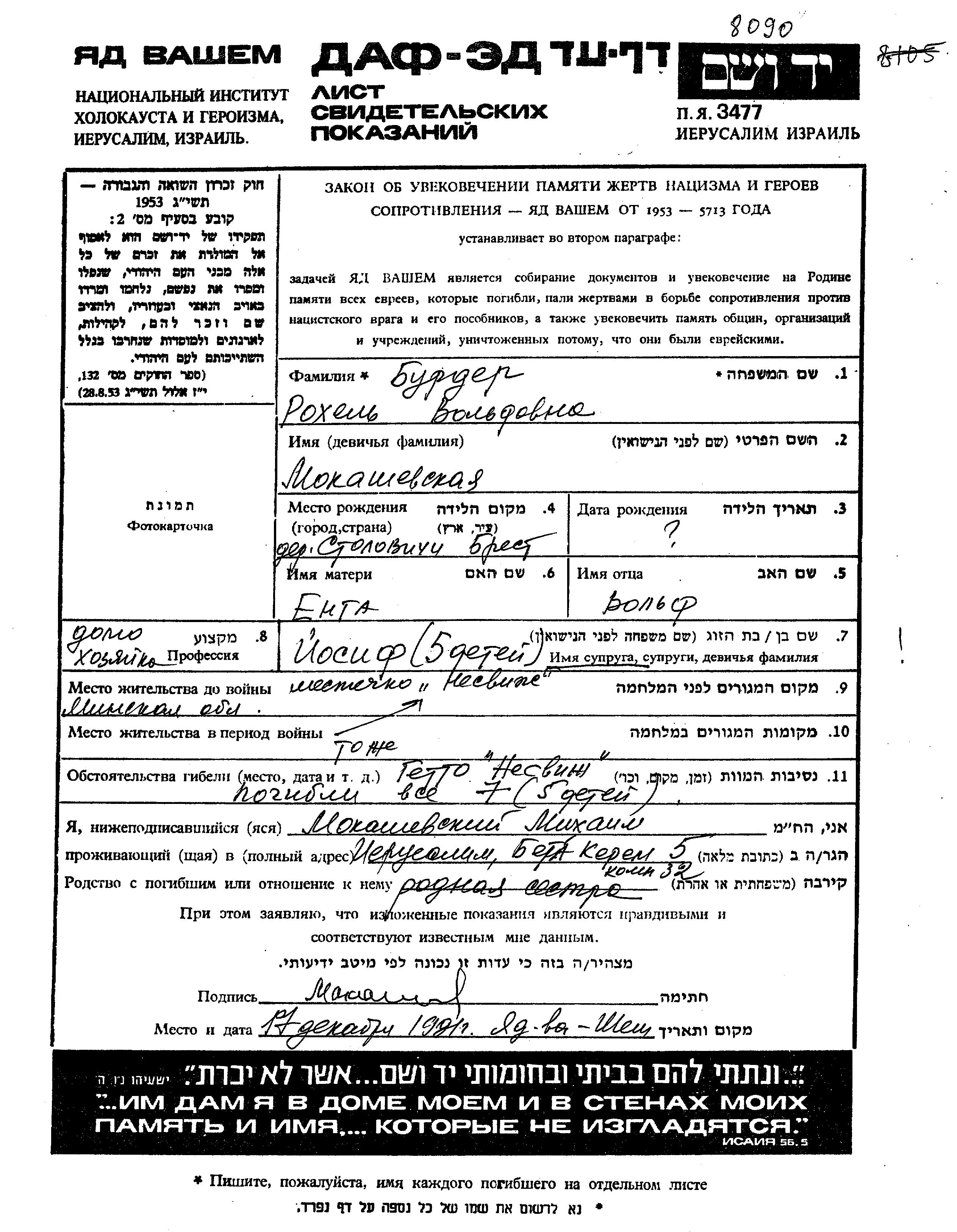 Рохель Бурдер, девичья фамилия Мокашевская, место рождения: Столовичи, Польша. Отец: Вольф, mать:Ента, девичья фамилия Вольфович. Домохозяйка. Женат / замужем. Место жительства до войны: Несвиж, Польша. Место во время войны: Несвиж, Польша.