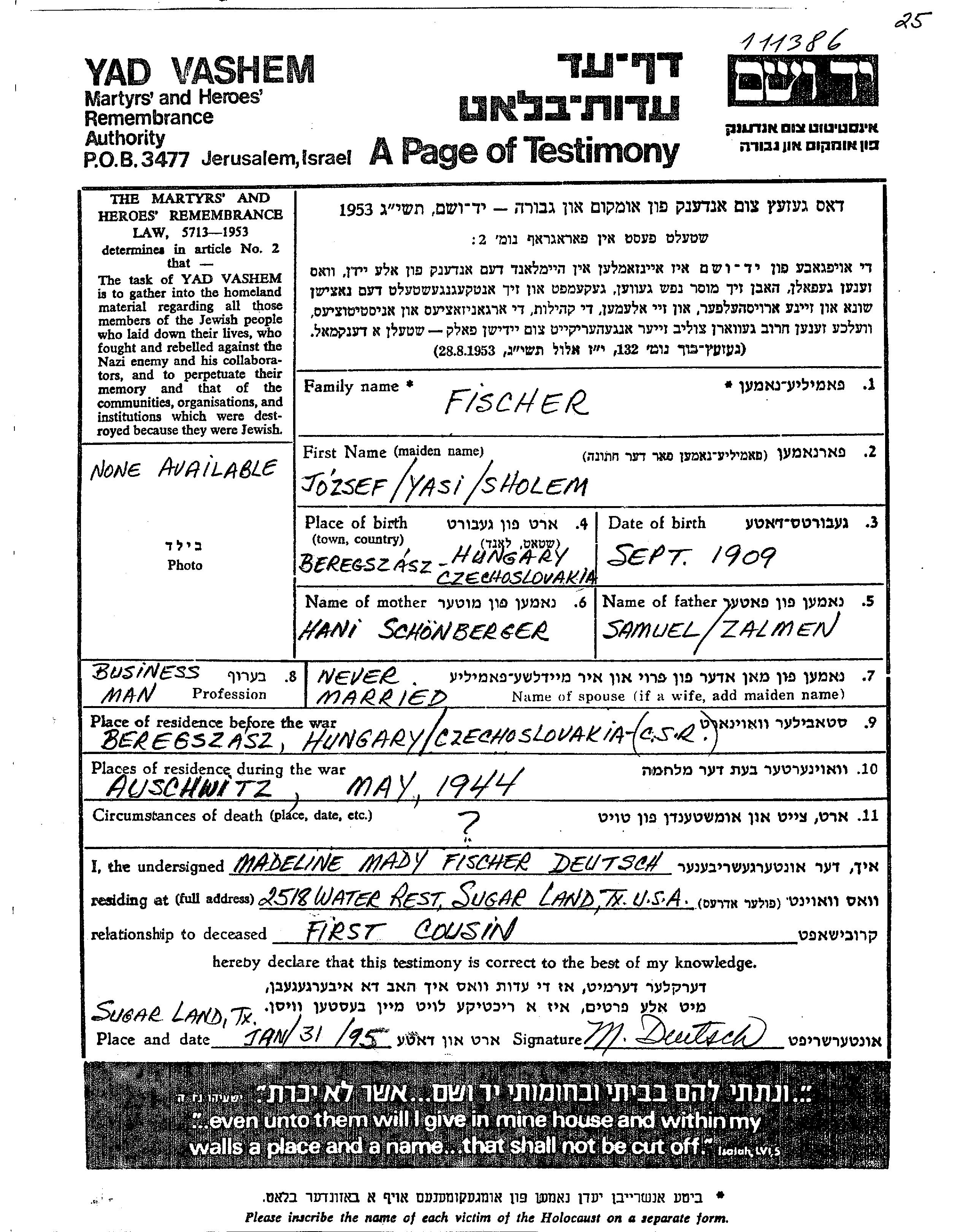Йозеф Шалом Фишер, место рождения: Берегсас, Чехословакия. Отец: Залмен Шмуэль, mать:Хани, девичья фамилия Шонбергер. Предприниматель. Холост / не замужем. Место жительства до войны: Берегсас, Чехословакия. Место во время войны: Чехословакия.