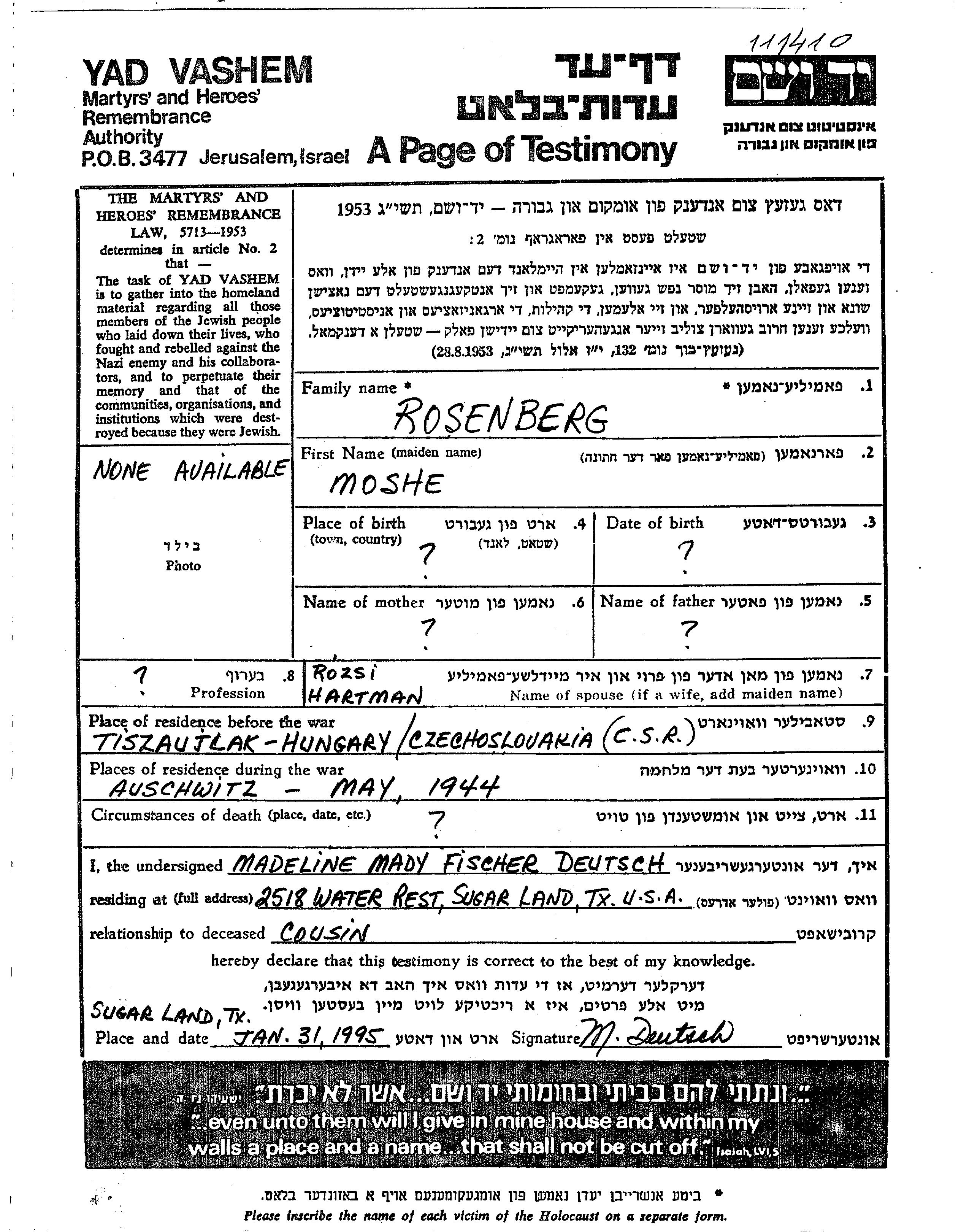 Моше Розенберг. Женат / замужем. Место жительства до войны: Тисауйлак, Чехословакия. Место во время войны: Чехословакия.