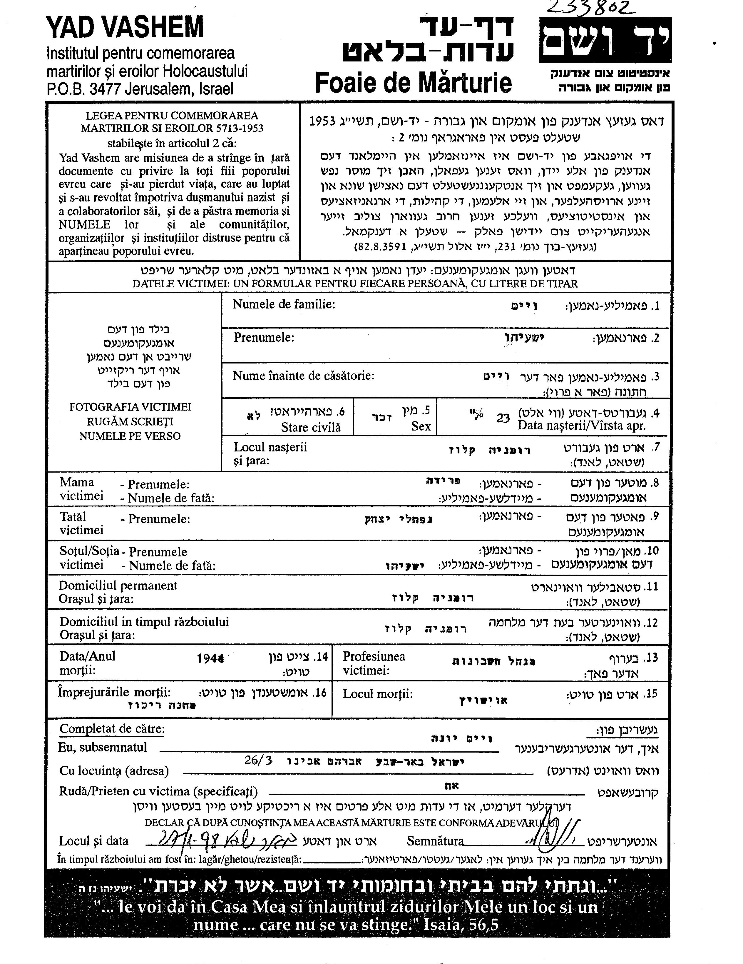 Вайс Иешаяху 1921 Клуж, Румыния Лист свидетельских показаний