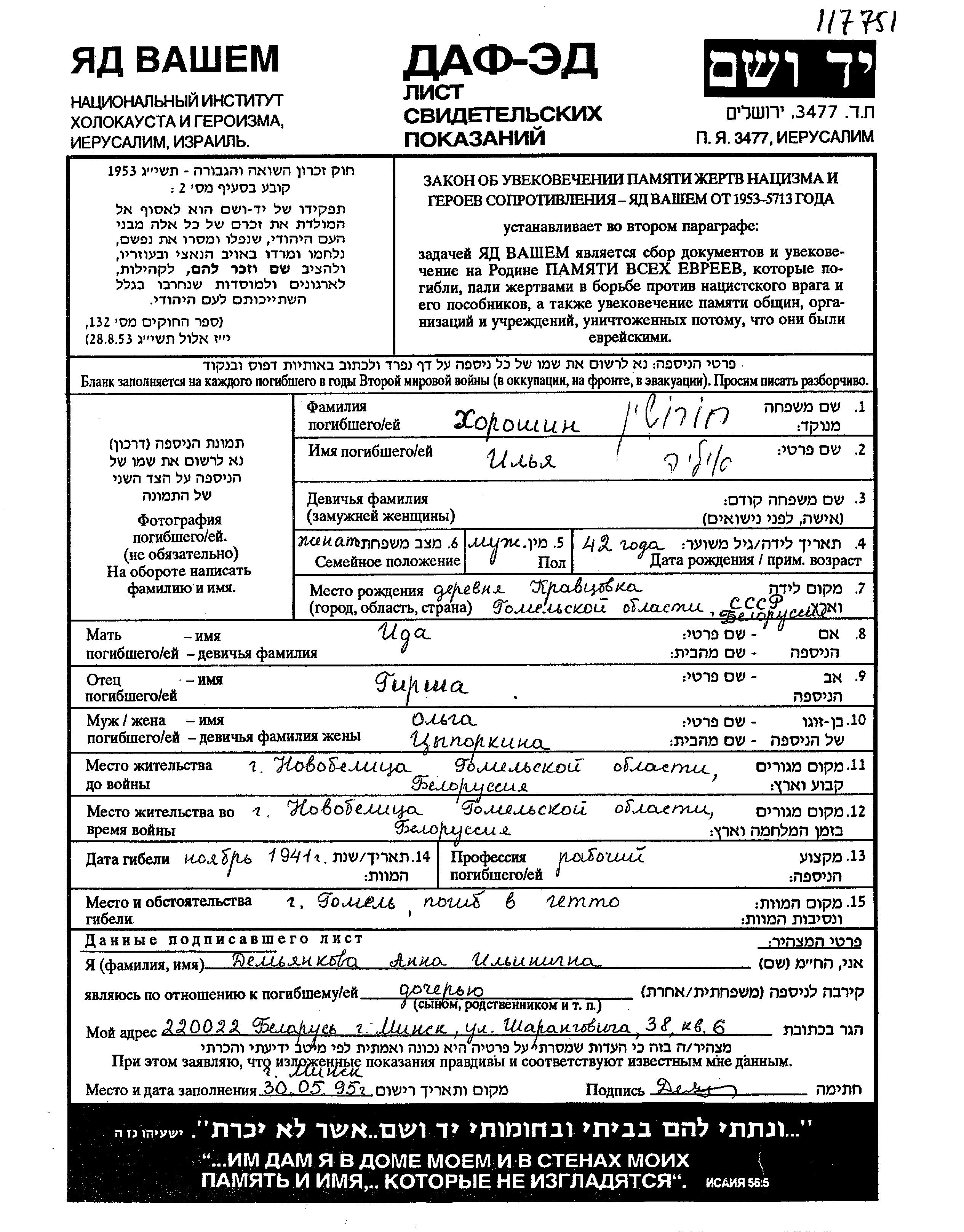 Илья Хорошин, место рождения: Кравцовка, Белоруссия (СССР). Отец: Гирша, mать:Ида. Рабочий / рабочая. Женат / замужем. Место жительства до войны: Новобелица, Белоруссия (СССР). Место во время войны: Новобелица, Белоруссия (СССР).