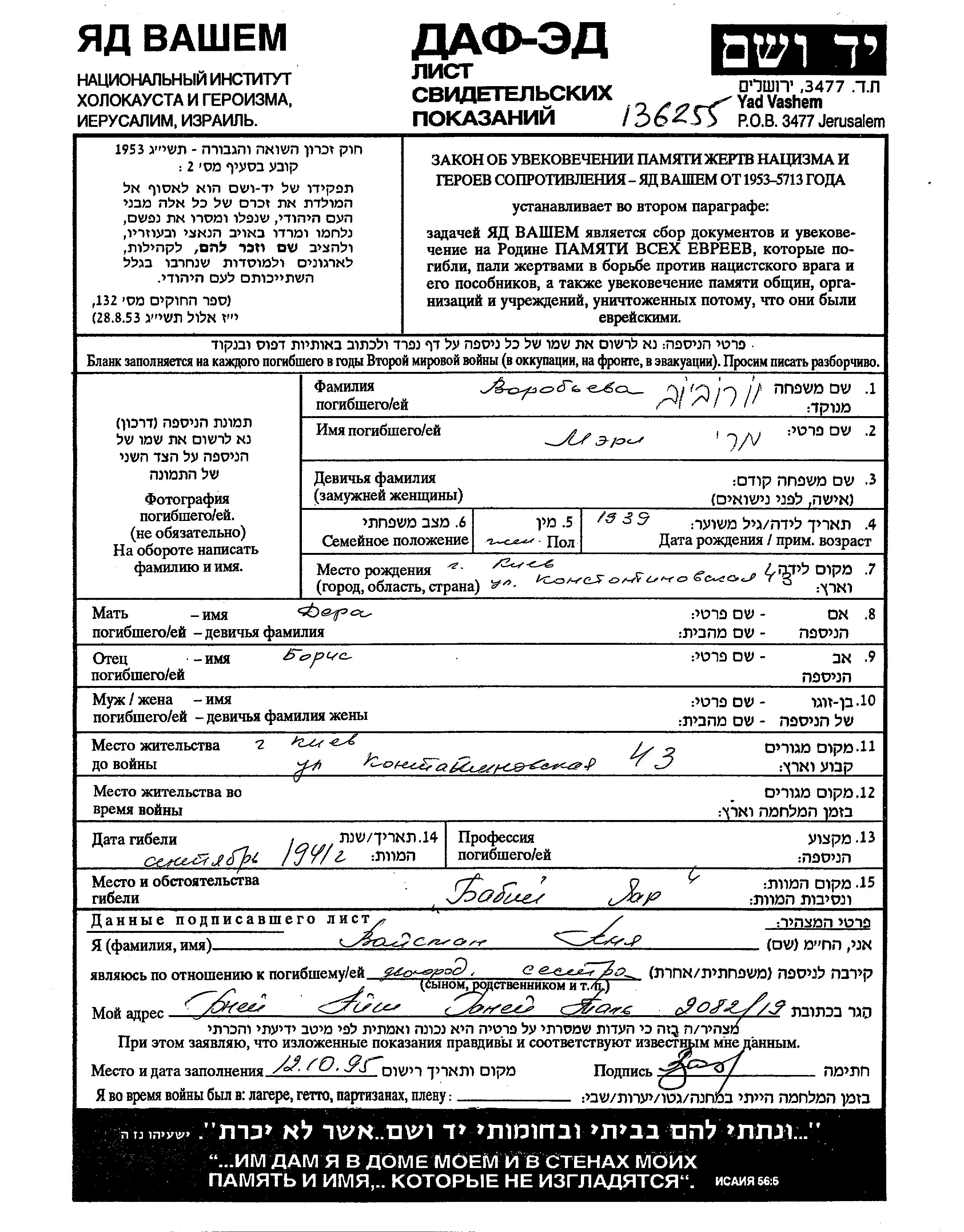 Воробьёв Мари 1939 Киев, Украина (СССР) Лист свидетельских показаний