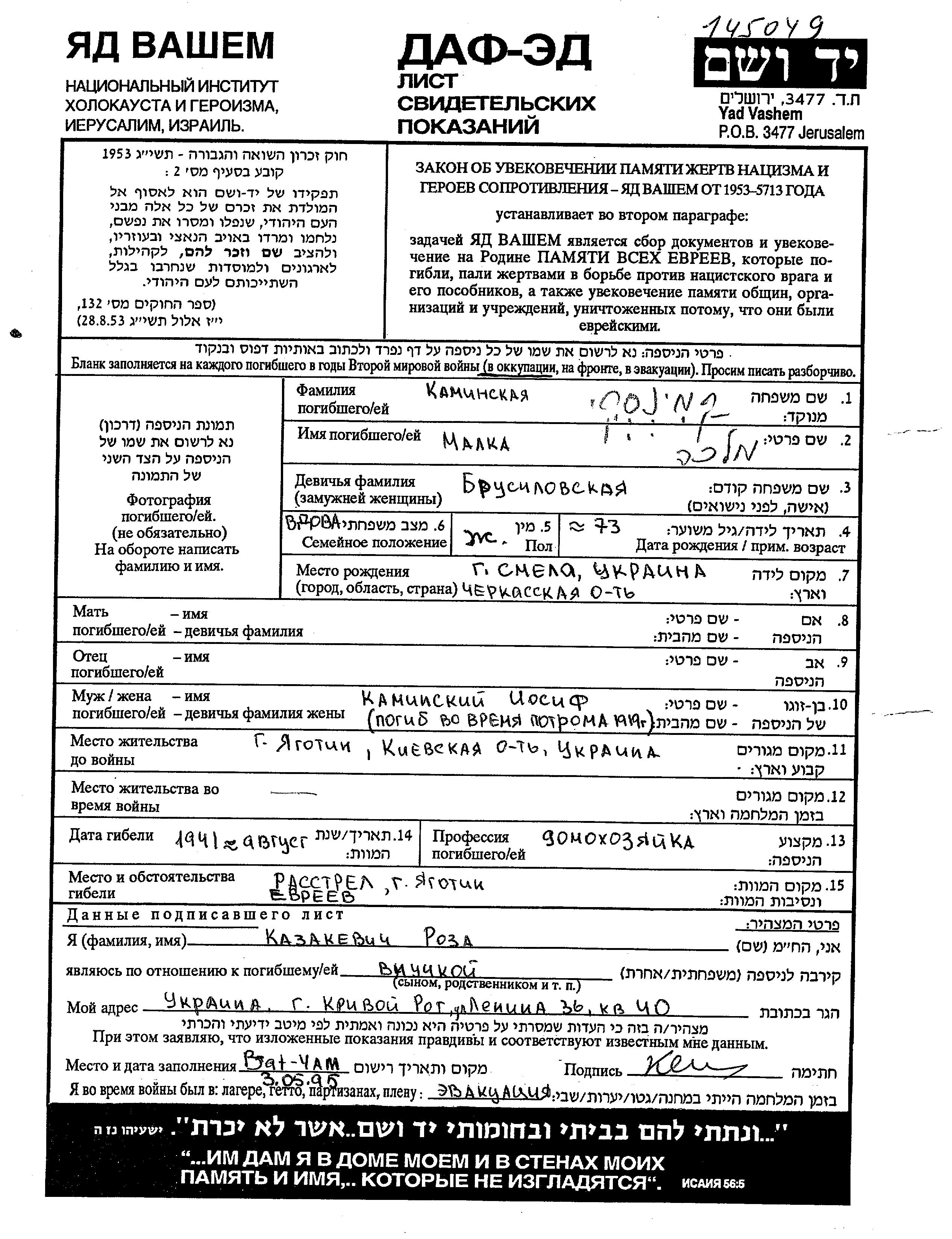 Малка Камински, девичья фамилия Брусиловский, место рождения: Смела, Украина (СССР). Домохозяйка. Женат / замужем. Место жительства до войны: Яготин, Украина (СССР). Место во время войны: Яготин, Украина (СССР).