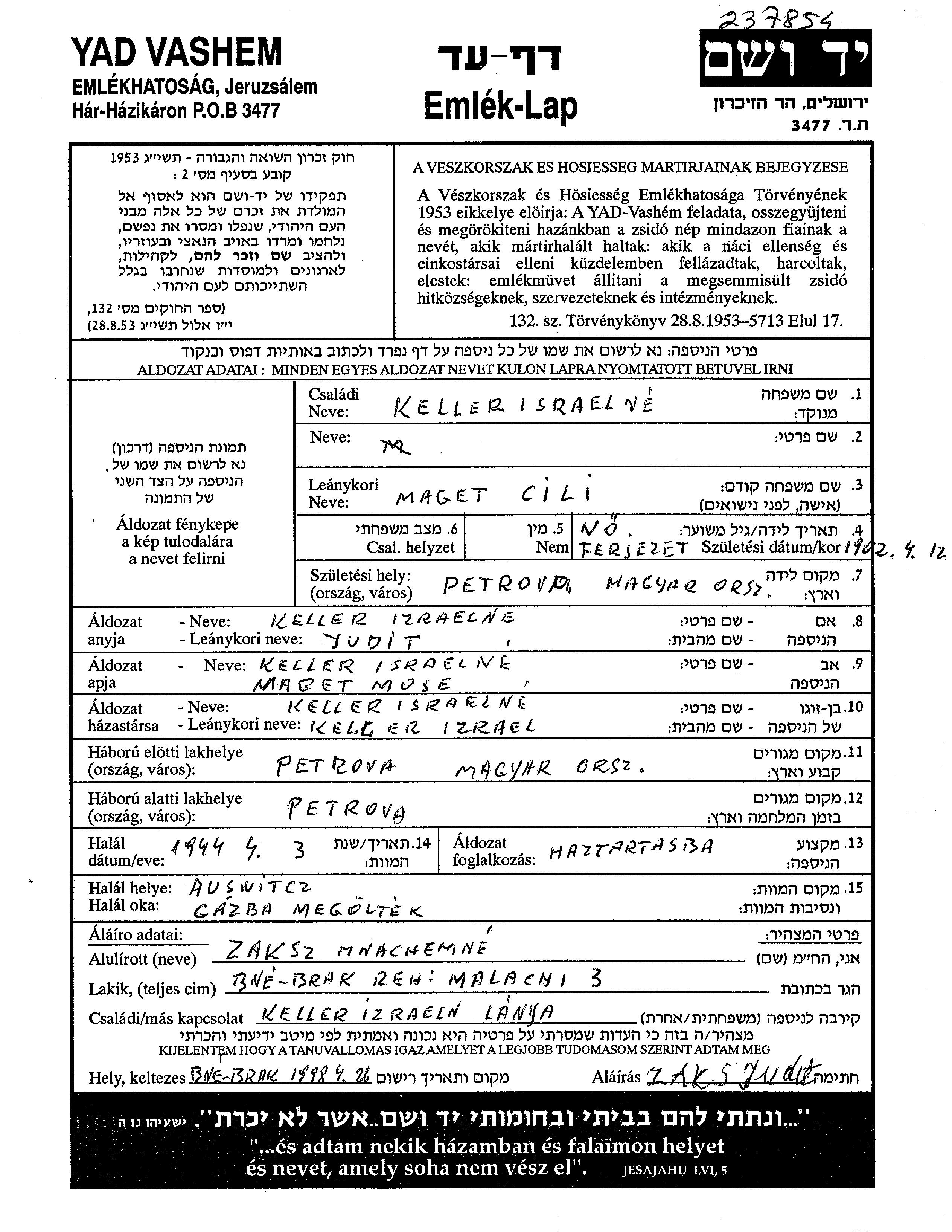 Цили Келлер, девичья фамилия Магет Мегет, место рождения: Петрова, Чехословакия. Отец: Моше, mать:Юдит. Домохозяйка. Женат / замужем. Место жительства до войны: Петрова, Чехословакия. Место во время войны: Петрова, Чехословакия.