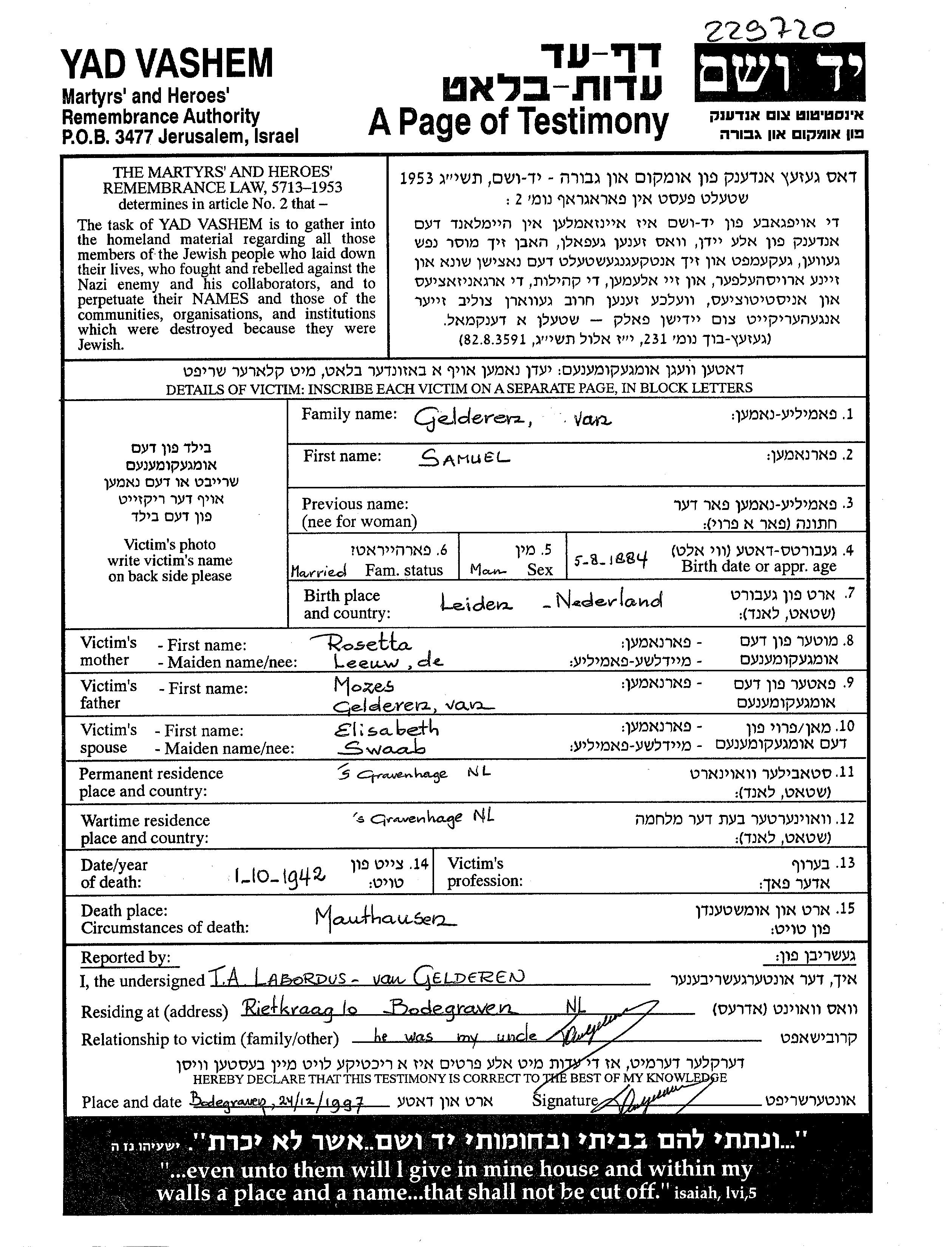 Самуэль Гелдерен ван, место рождения: Лейден, Нидерланды. Отец: Можес, mать:Розетта, девичья фамилия Леув де Лев де. Женат / замужем. Место жительства до войны: Гаага, Нидерланды. Место во время войны: Гаага, Нидерланды.
