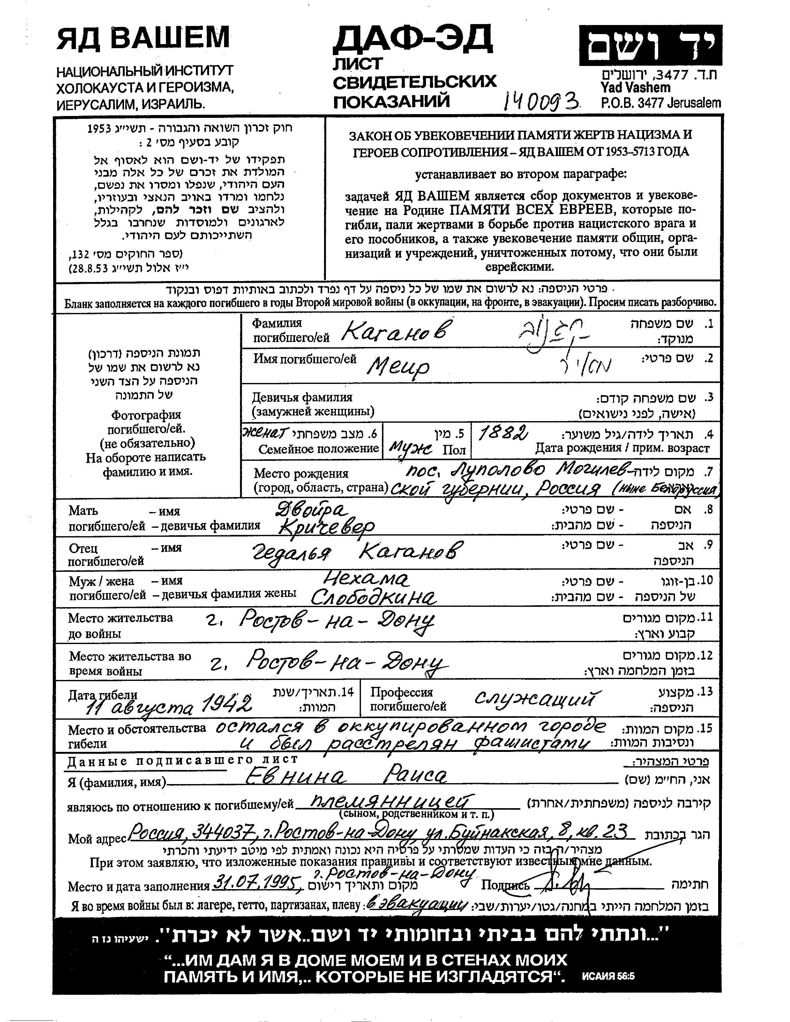 Меир Каганов, место рождения: Луполово, Белоруссия (СССР). Отец: Гедаля, mать:Двойра, девичья фамилия Кричевер. Клерк. Женат / замужем. Место жительства до войны: Ростов, Россия (СССР). Место во время войны: Ростов, Россия (СССР).
