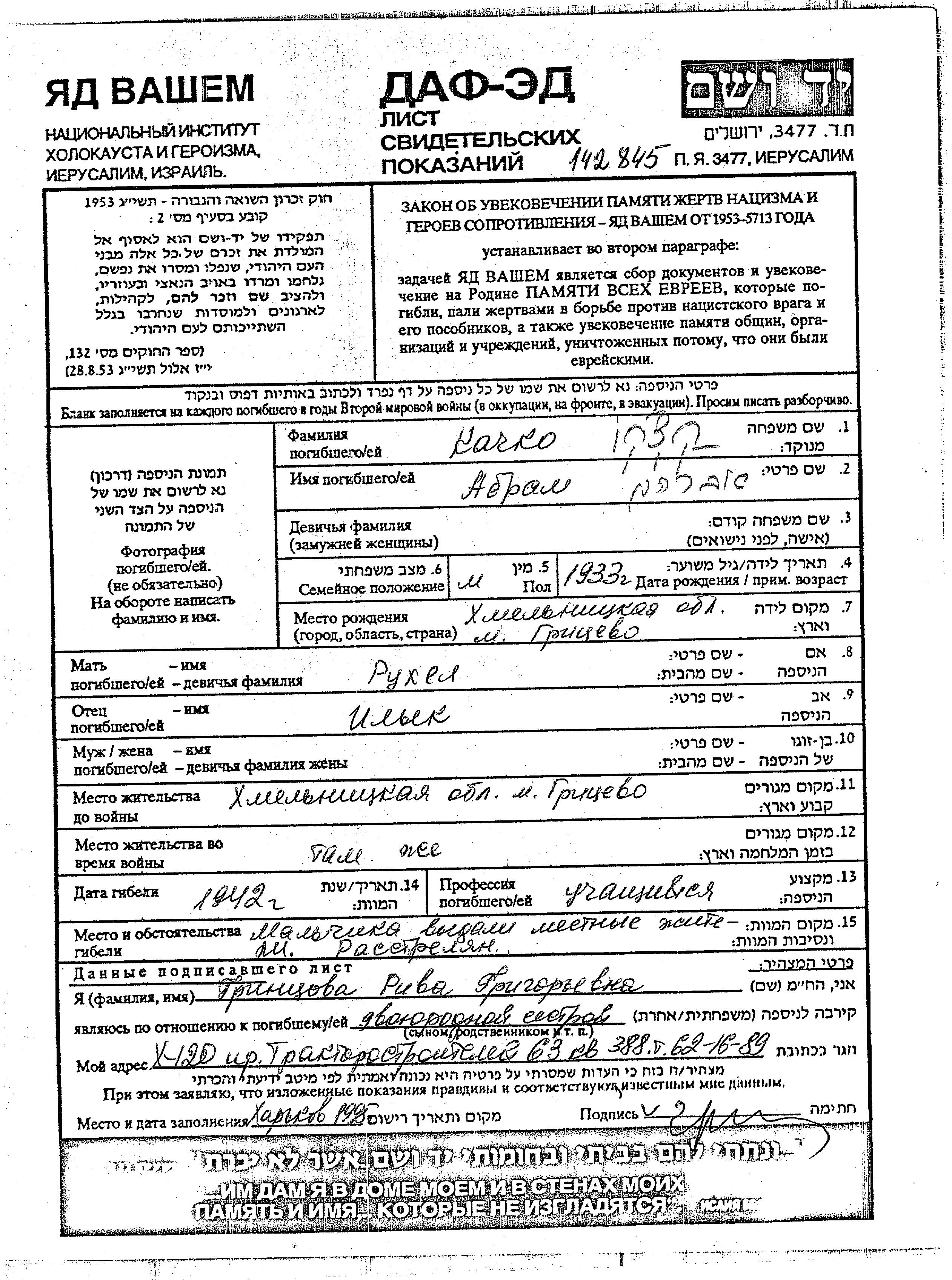 Качко Абрам 1933 Грицев, Украина (СССР) Лист свидетельских показаний