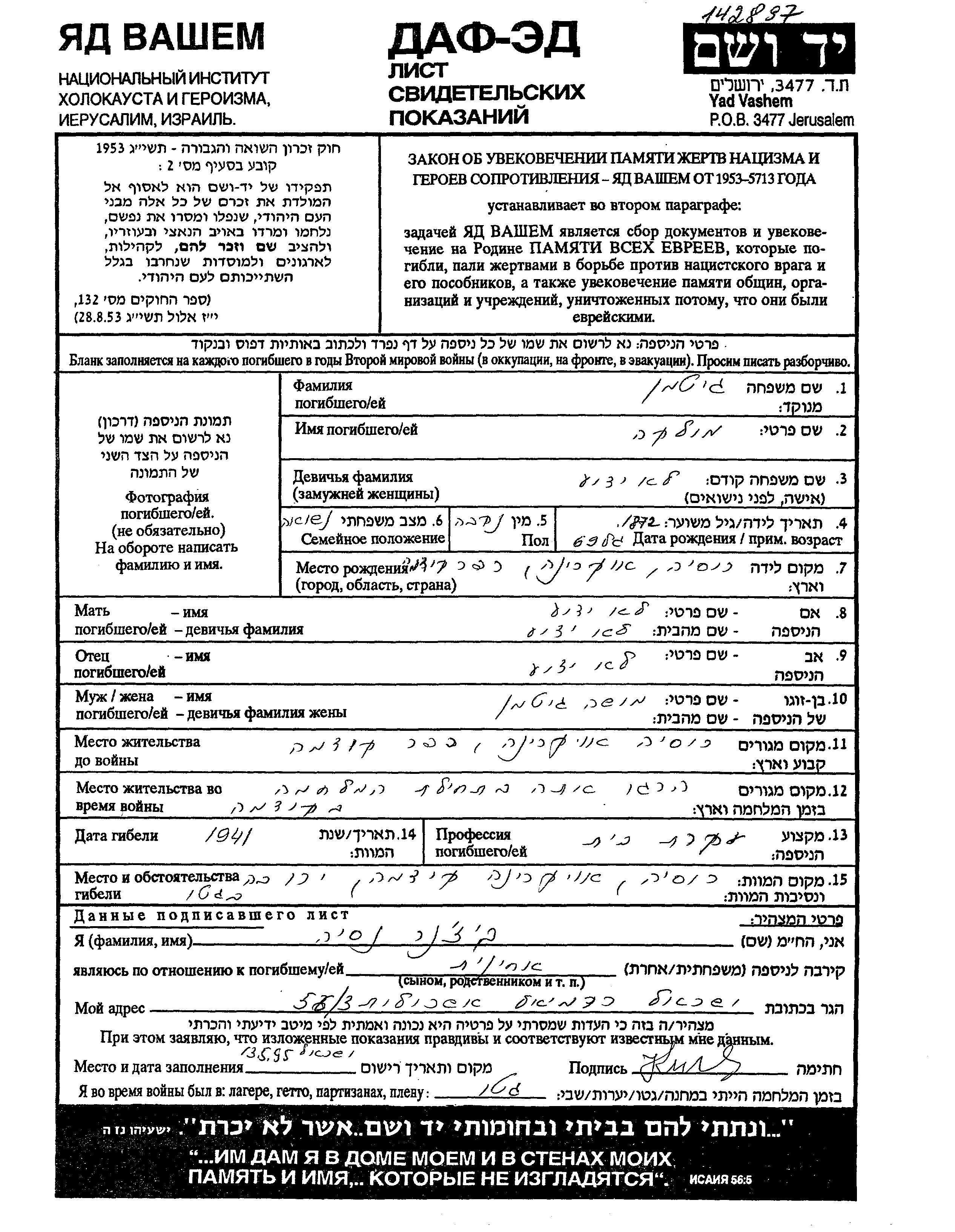 Яд Вашем - Листы свидетельских показаний Мемориального фонда
