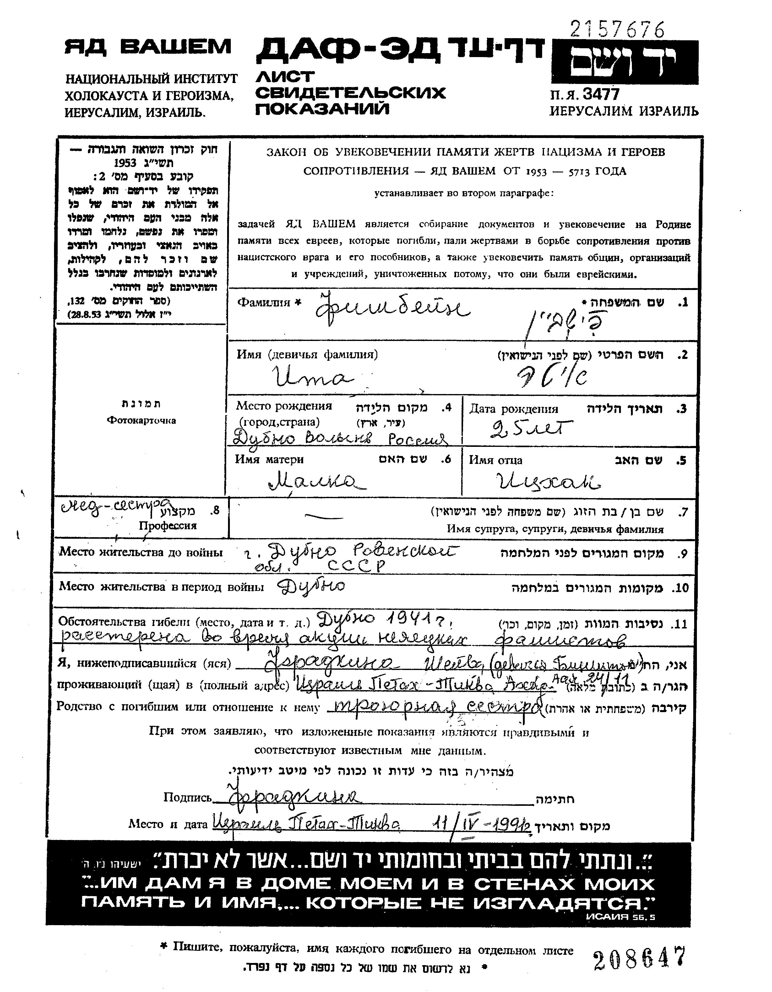 Фишбейн Ита 1916 Дубно, Польша Лист свидетельских показаний