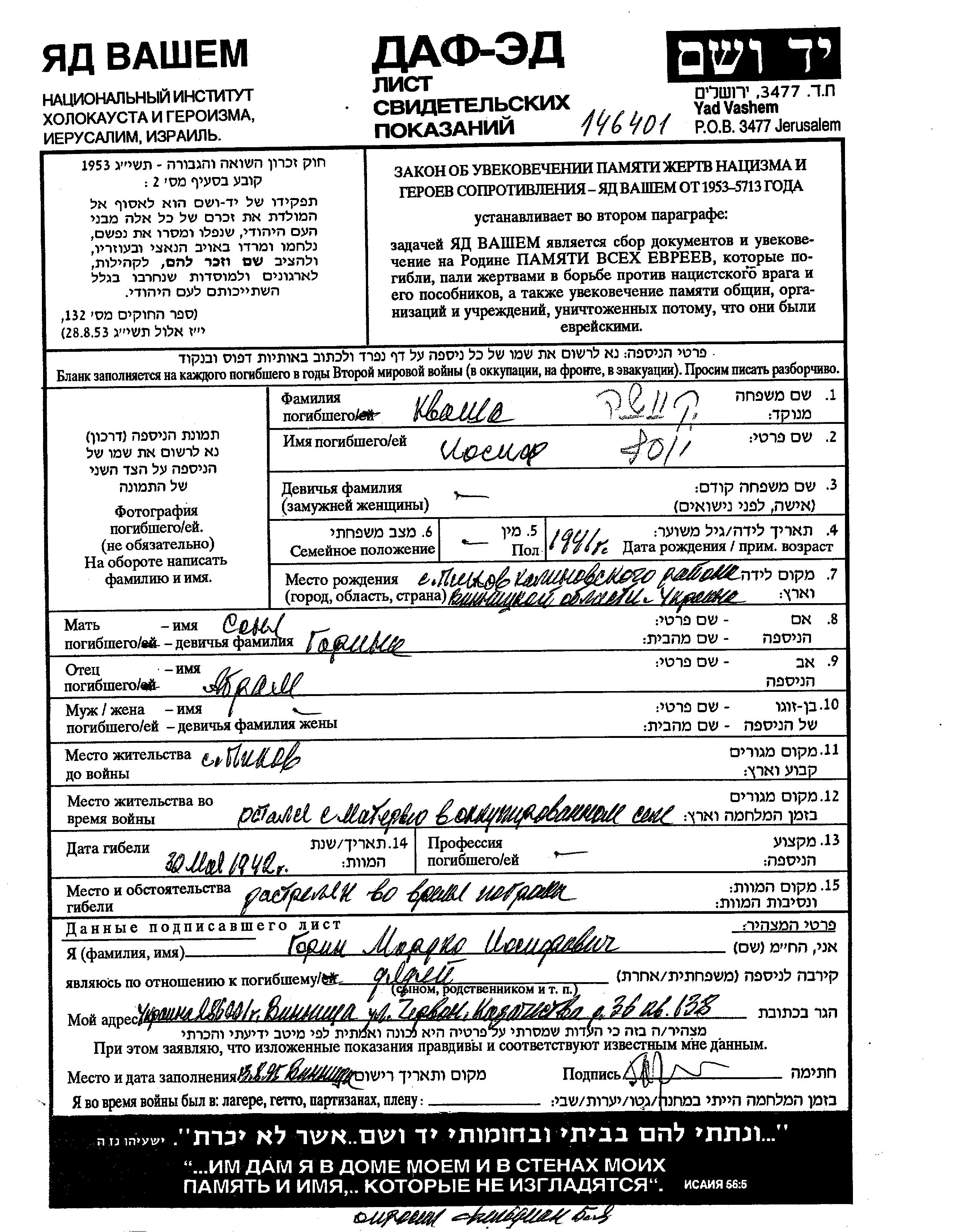 Кваша Иосиф 1941 Пиков, Украина (СССР) Лист свидетельских показаний