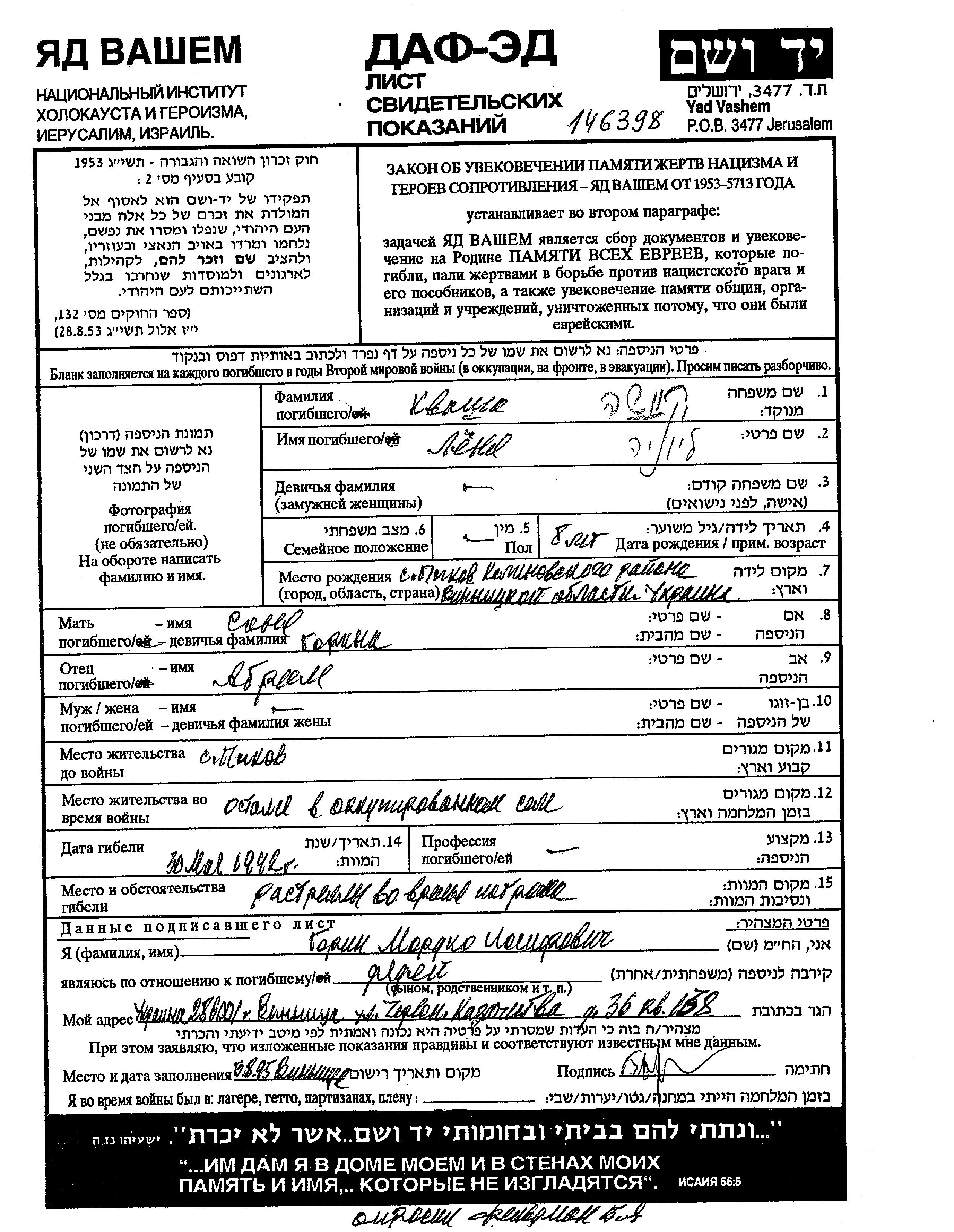 Яд Вашем - Листы свидетельских показаний Мемориального фонда