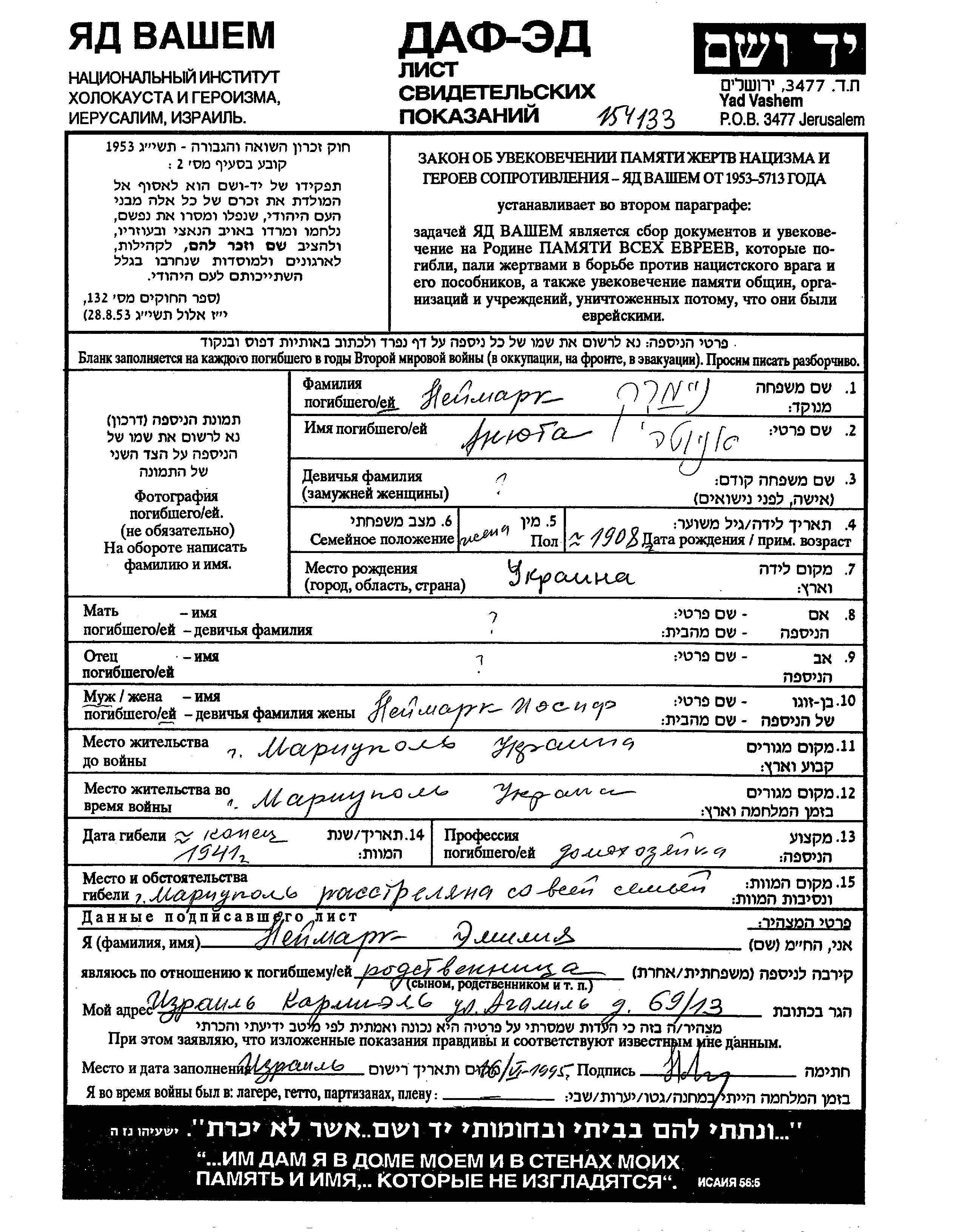 Неймарк Анюта 1908 Мариуполь, Украина (СССР) Лист свидетельских показаний