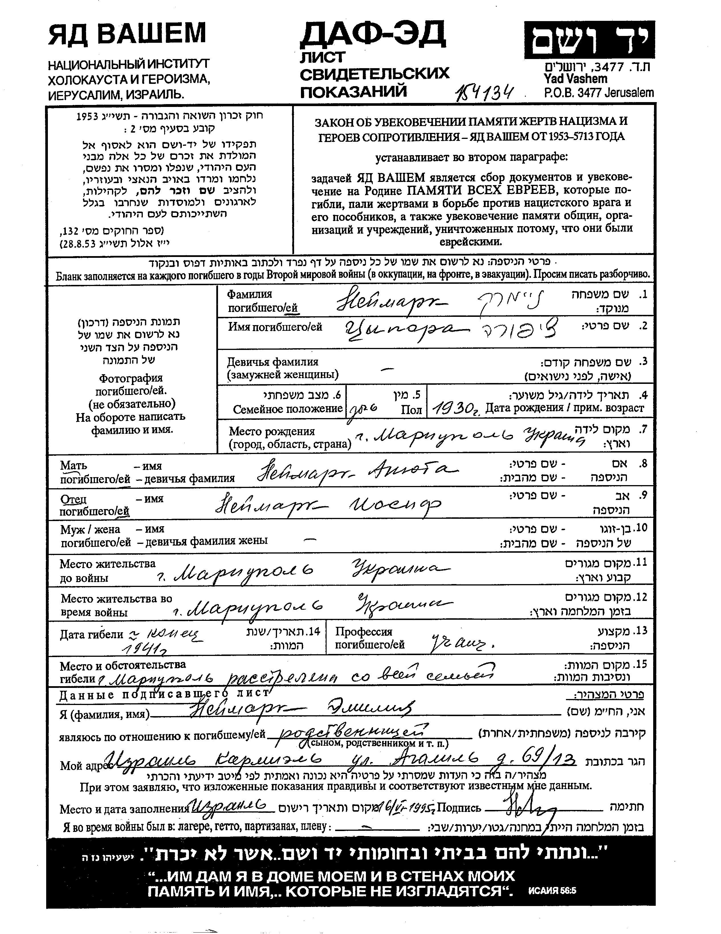 Яд Вашем - Листы свидетельских показаний Мемориального фонда