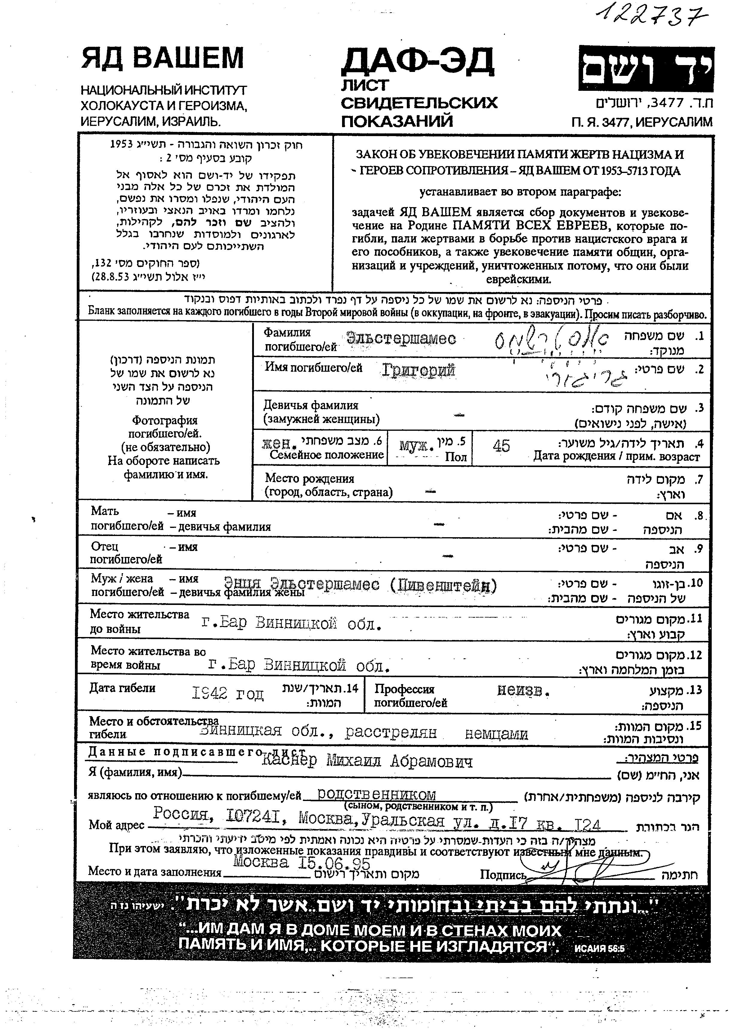 Эльстершамес Григорий 1897 Бар, Украина (СССР) Лист свидетельских показаний