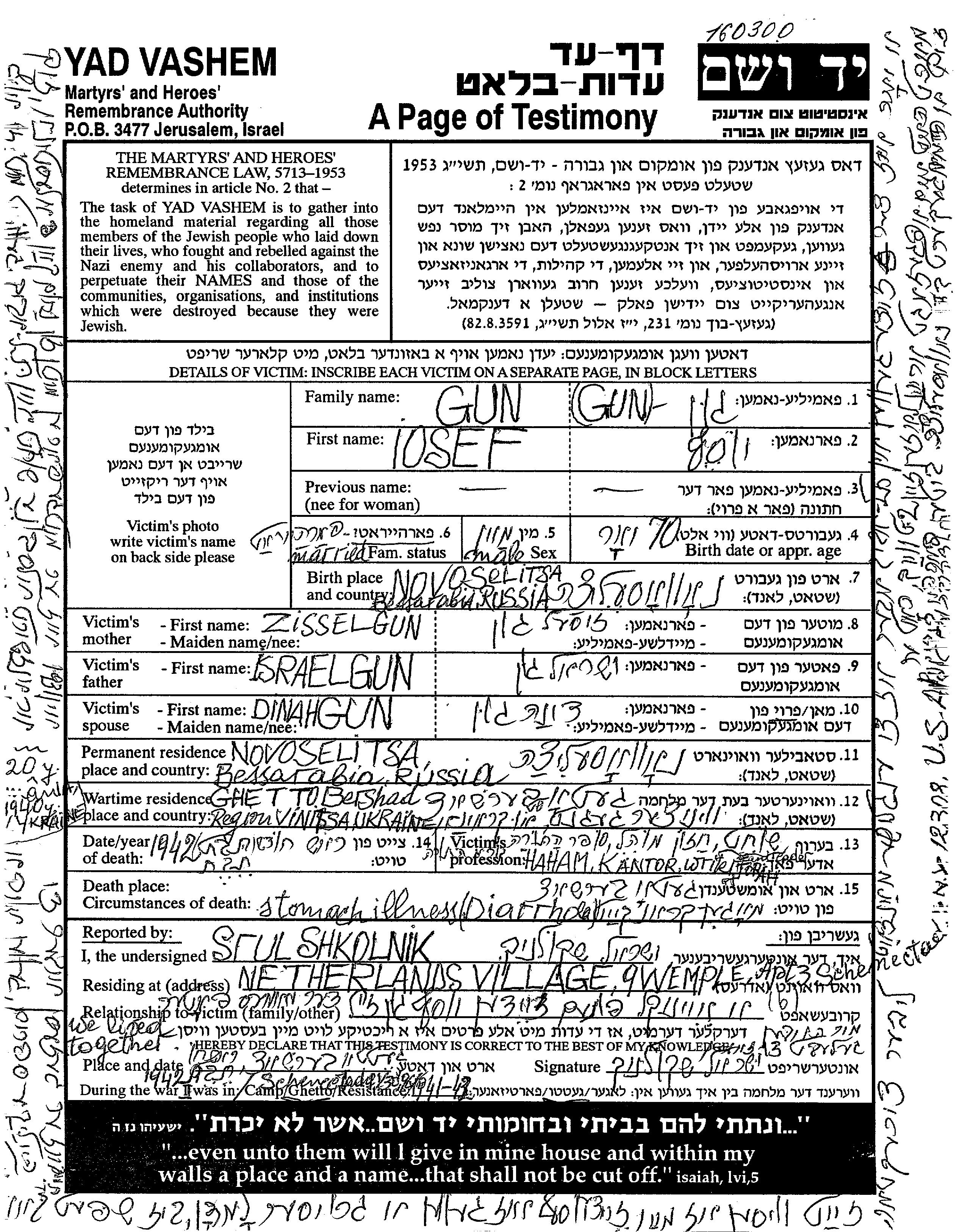 Йосеф Гун, место рождения: Новоселица, Румыния. Отец: Исраэль, mать:Зиссел. Резник. Женат / замужем. Место жительства до войны: Новоселица, Румыния. Место во время войны: Бершадь, Украина (СССР).