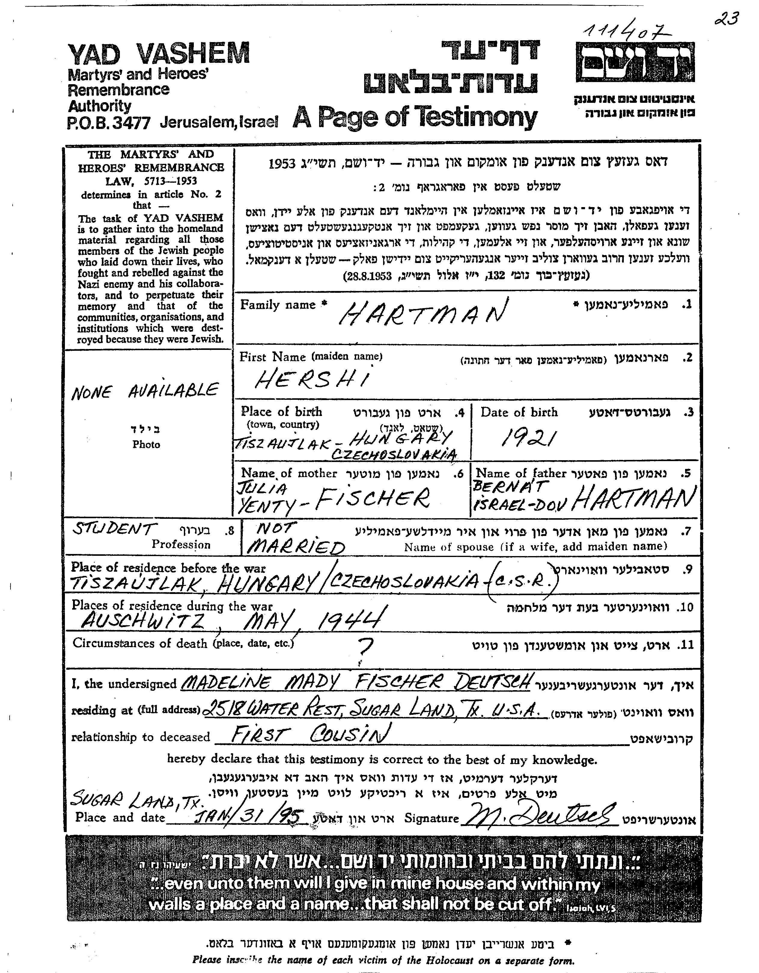 Херши Хартман, место рождения: Тисауйлак, Чехословакия. Отец: Бернат Исраэль Дов, mать:Юлия Енты Ента, девичья фамилия Фишер. Студент / студентка. Холост / не замужем. Место жительства до войны: Тисауйлак, Чехословакия. Место во время войны: Чехословакия.