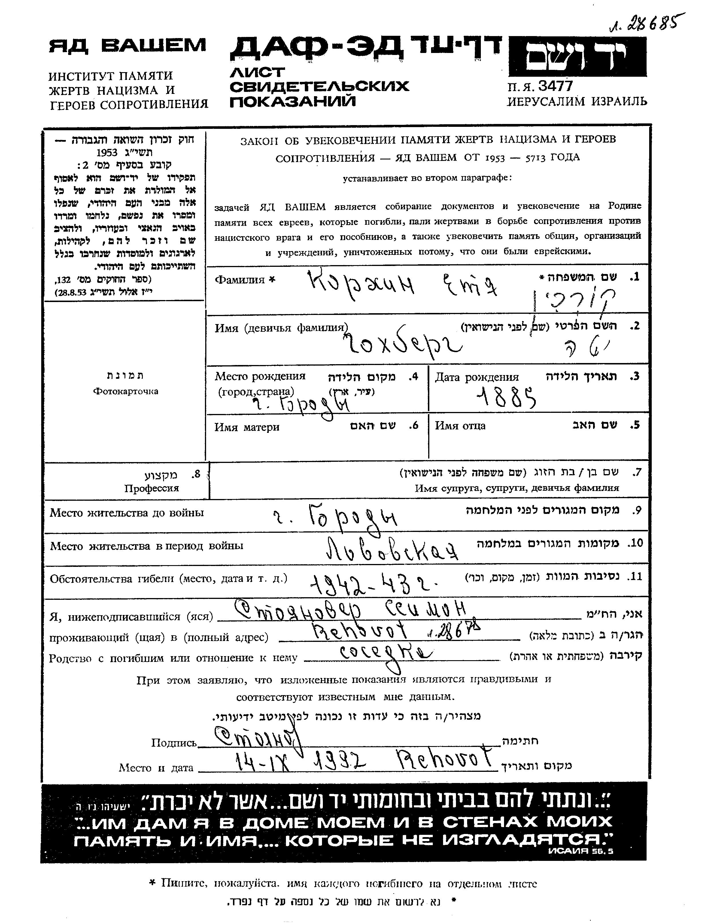 Корхин Этя 1885 Броды, Польша Лист свидетельских показаний