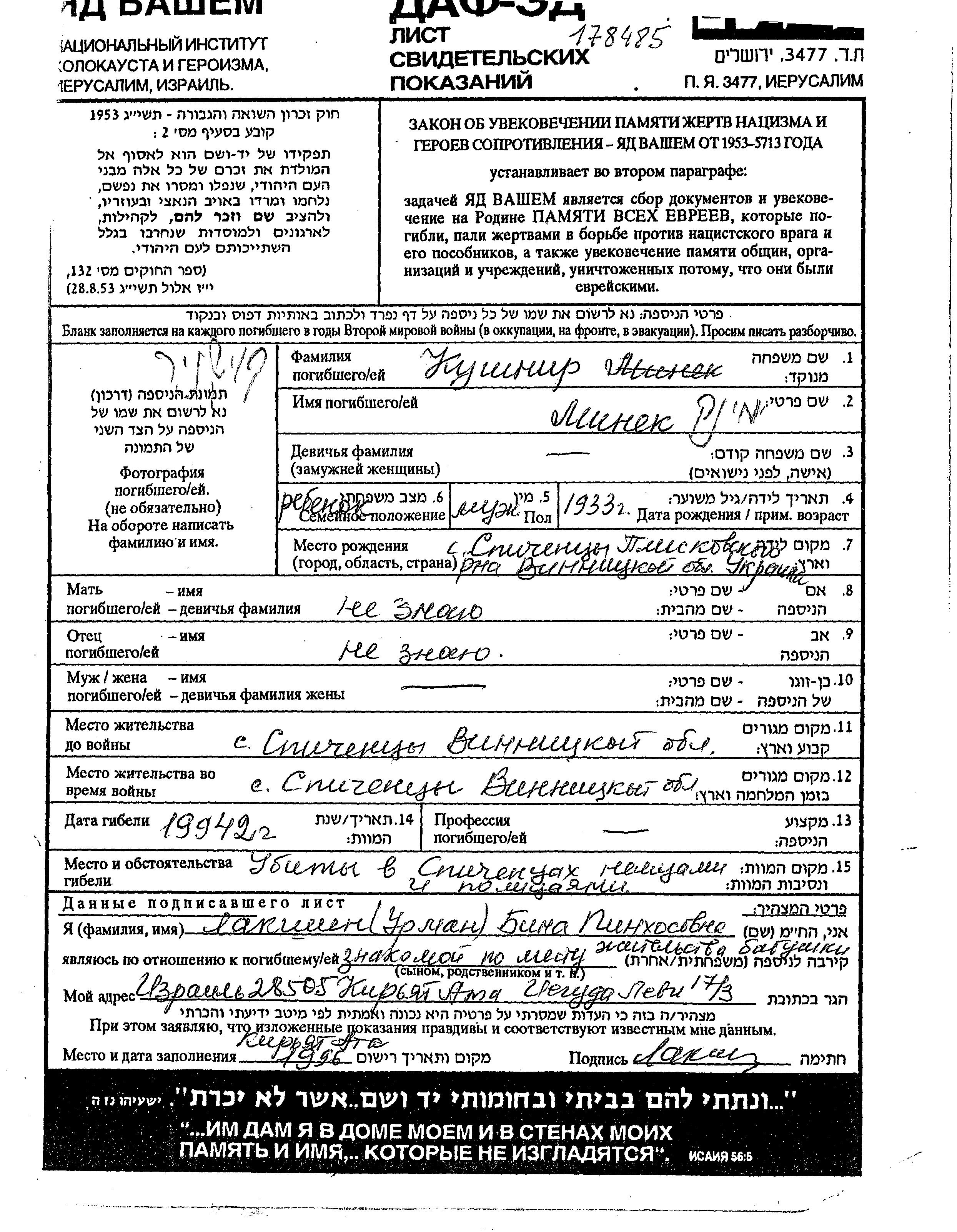 Кушнир Минек Минк 1933 Спичинцы, Украина (СССР) Лист свидетельских показаний