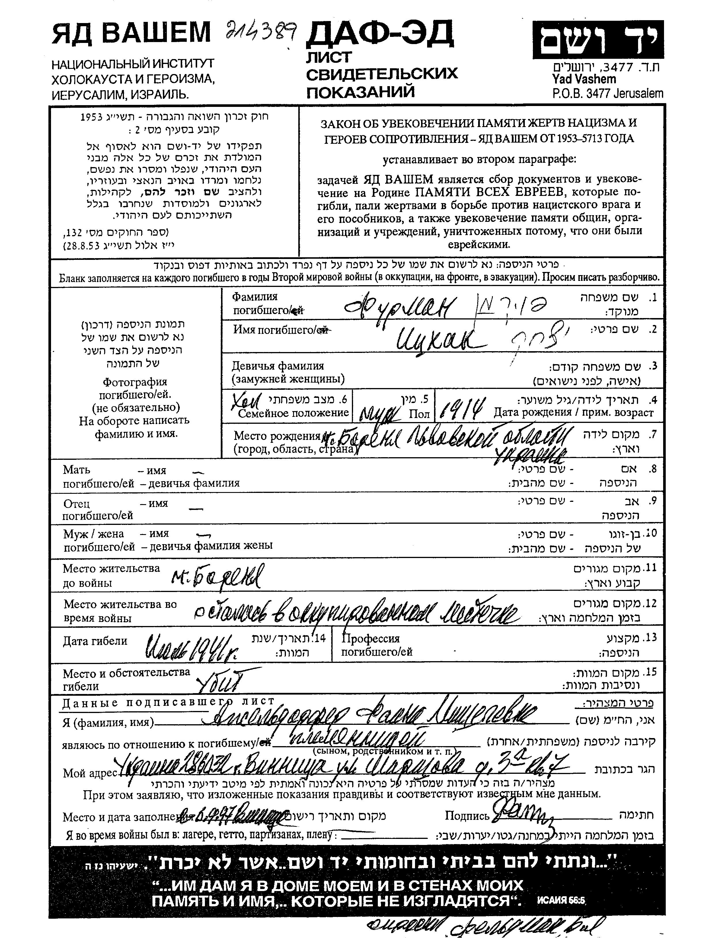 Яд Вашем - Листы свидетельских показаний Мемориального фонда