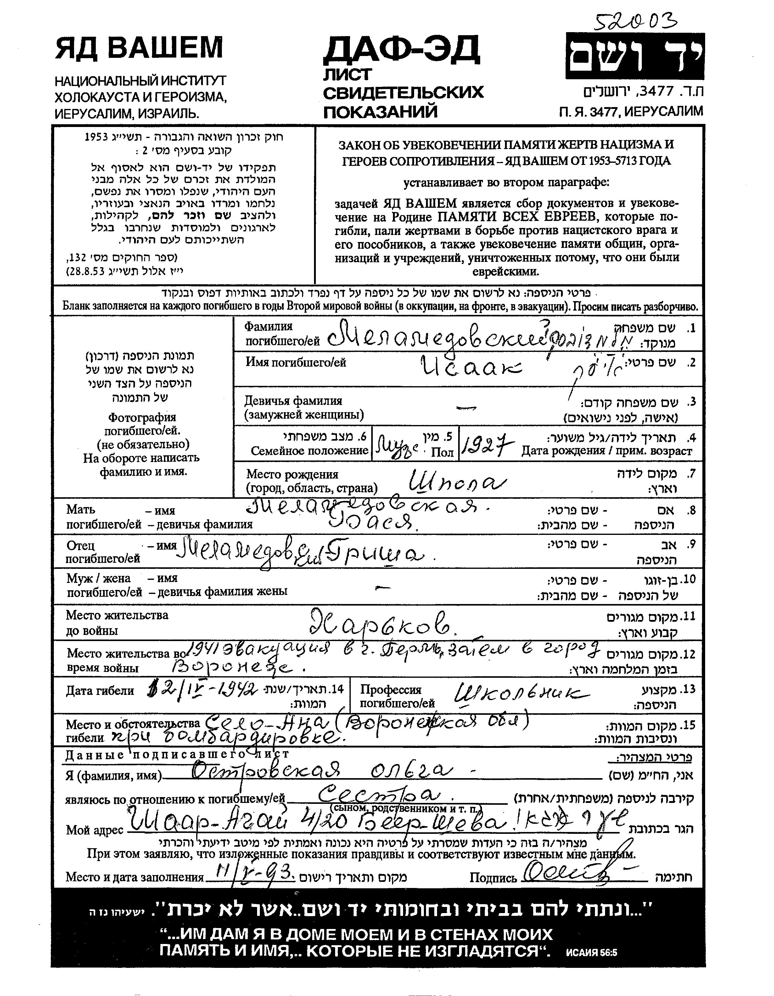 Меламедовский Исаак 1927 Харьков, Украина (СССР) Лист свидетельских показаний