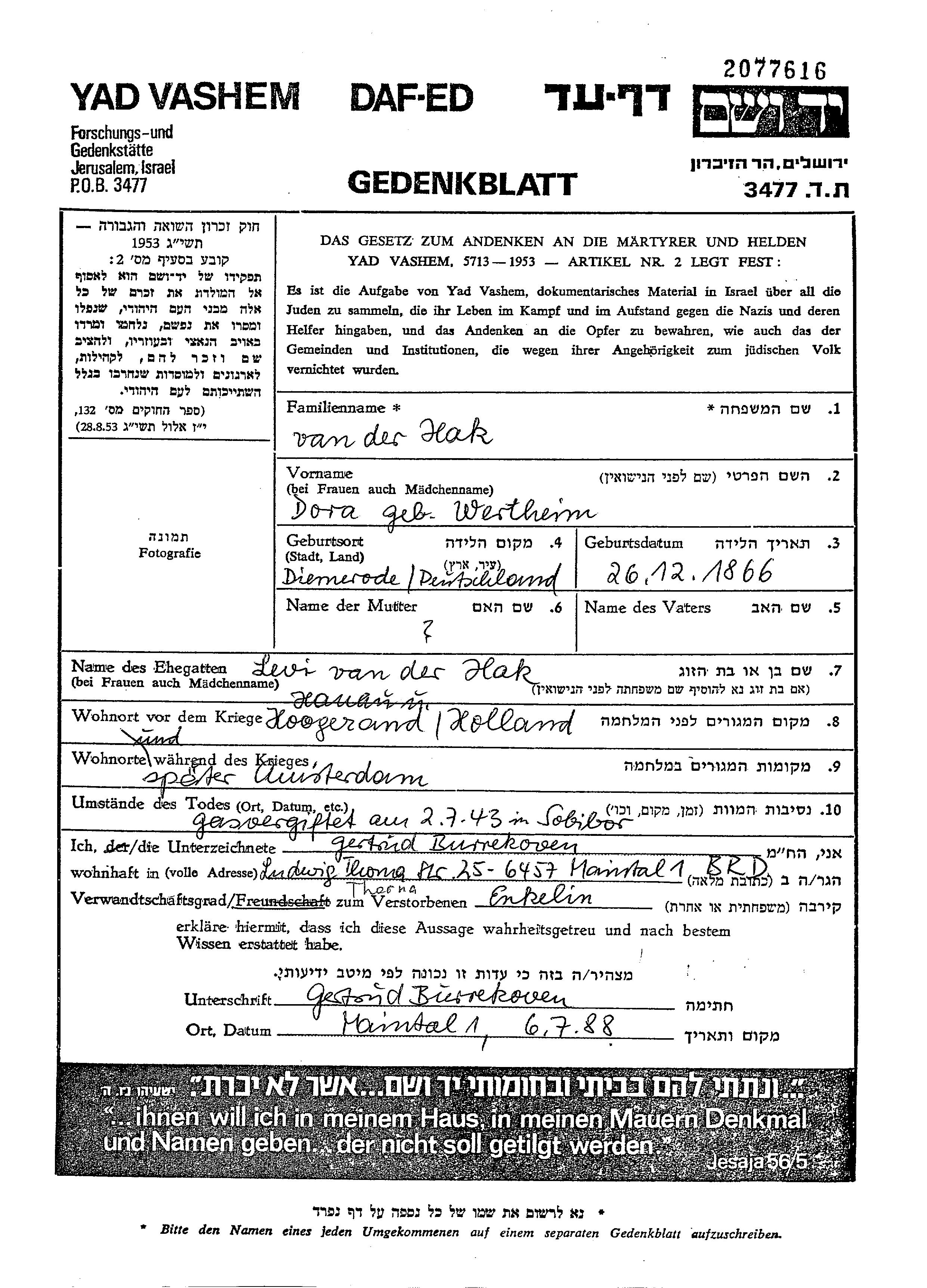 Дора Хак ван дер, девичья фамилия Вертхейм, место рождения: Димероде, Германия. Женат / замужем. Место жительства до войны: Хогезанд, Нидерланды. Место во время войны: Амстердам, Нидерланды.