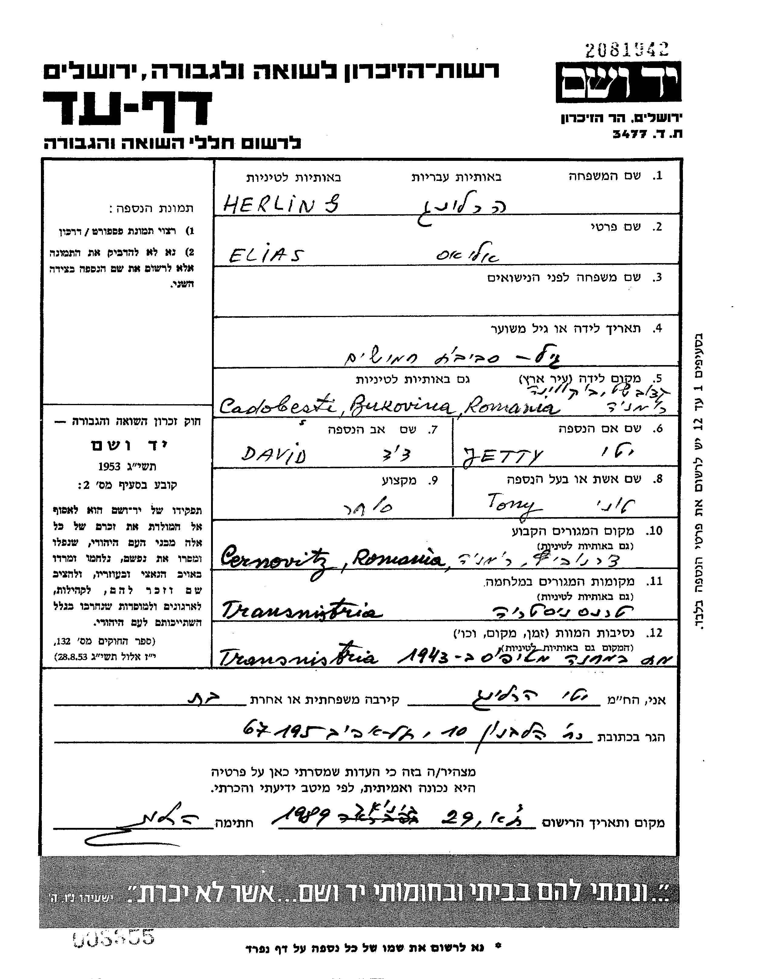 Херлинг Элиас Черновцы, Румыния Лист свидетельских показаний