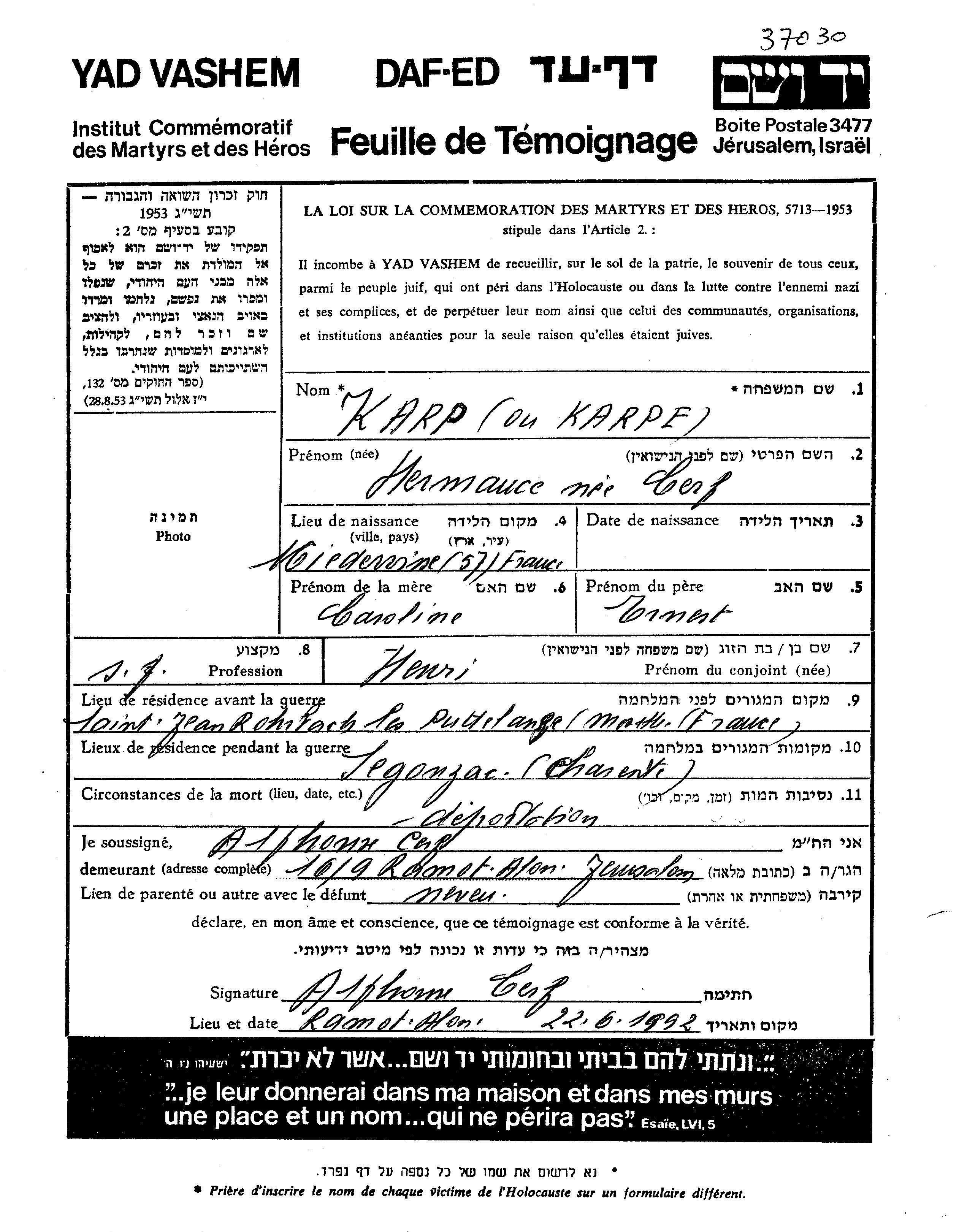 Херманс Карп, девичья фамилия Церф, место рождения: Нидервиссе, Франция. Отец: Эрнест, mать:Каролине. Женат / замужем. Место жительства до войны: Сен-Жан-Рорбак, Франция. Место во время войны: Сегонзак, Франция.