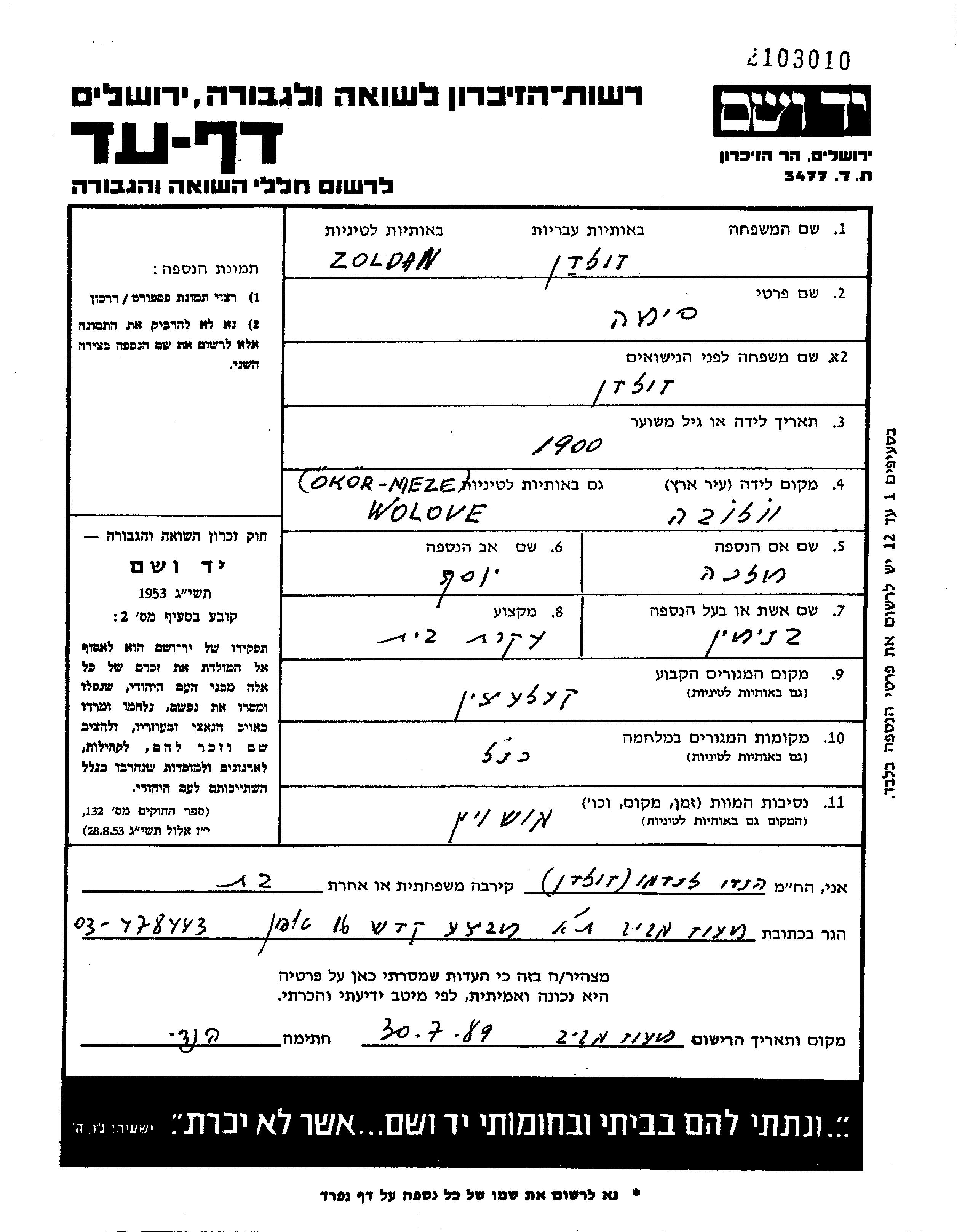 Сима Зольдан, девичья фамилия Зольдан, место рождения: Волове, Чехословакия. Отец: Иосеф, mать:Малка. Домохозяйка. Женат / замужем. Место жительства до войны: Келечин, Чехословакия. Место во время войны: Келечин, Чехословакия.