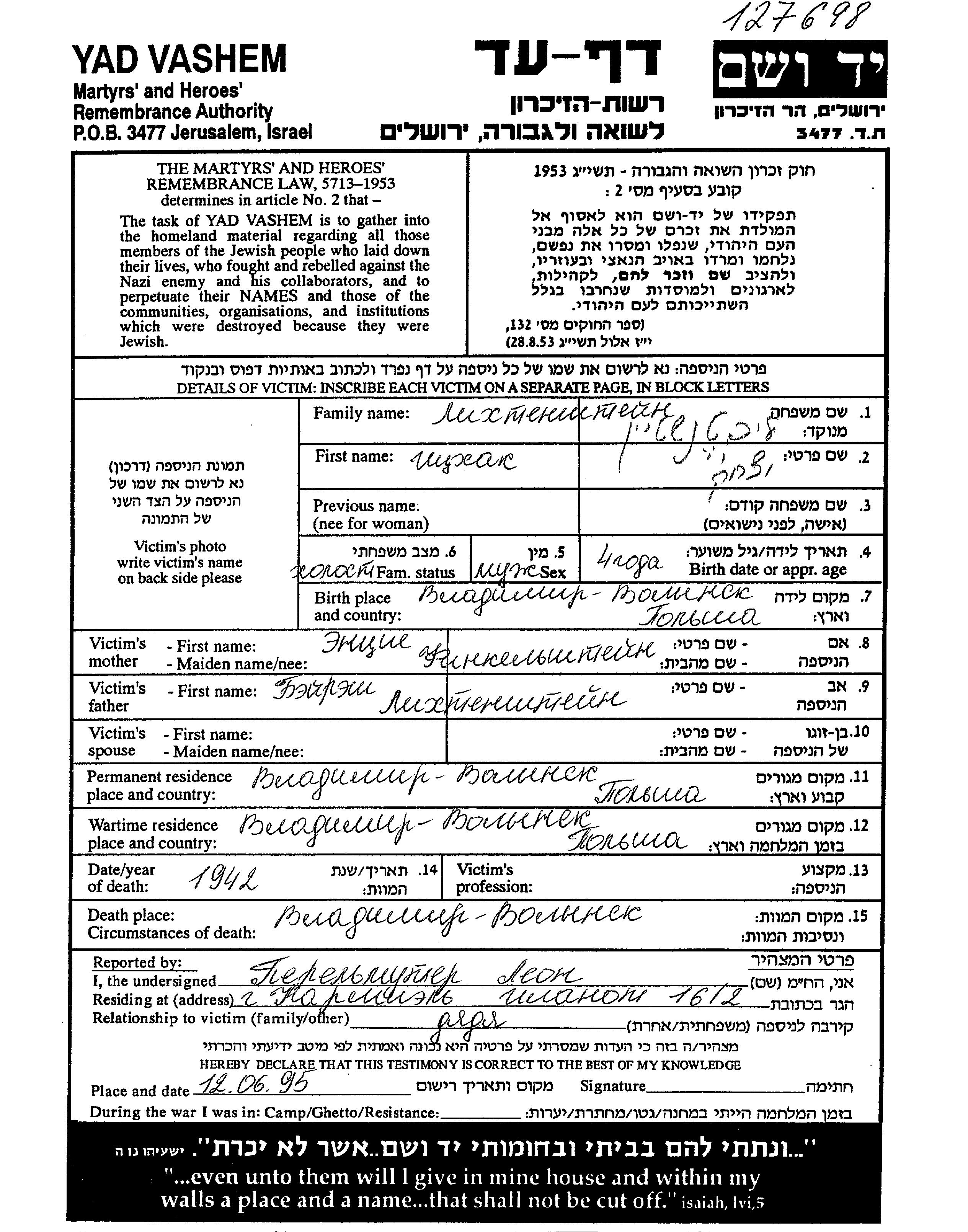 Ицхак Лихтенштейн, место рождения: Влодзимеж, Польша. Отец: Бейреш, mать:Entzie Энця, девичья фамилия Финкельштейн. Ребенок. Место жительства до войны: Влодзимеж, Польша. Место во время войны: Влодзимеж, Польша.