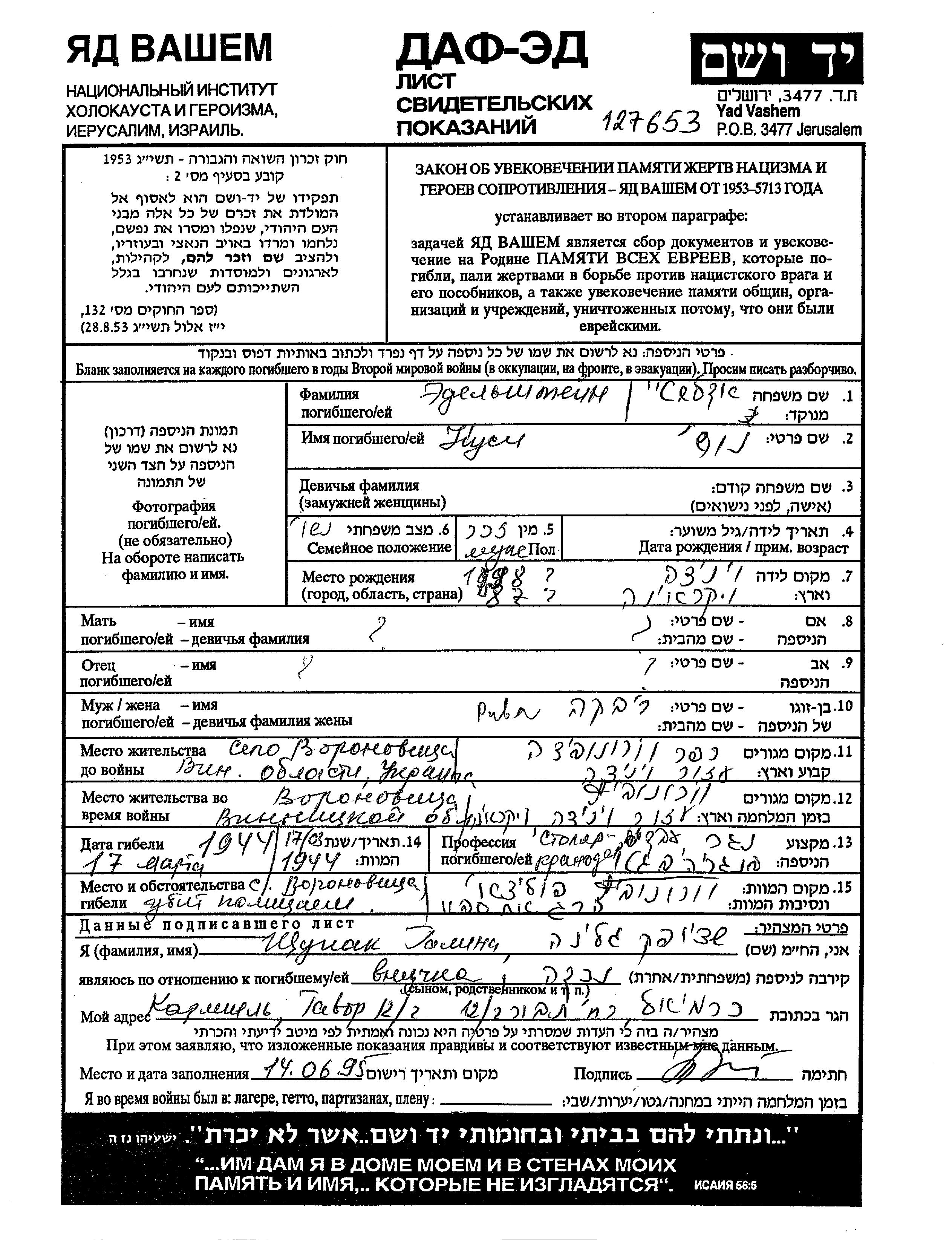 Яд Вашем - Листы свидетельских показаний Мемориального фонда