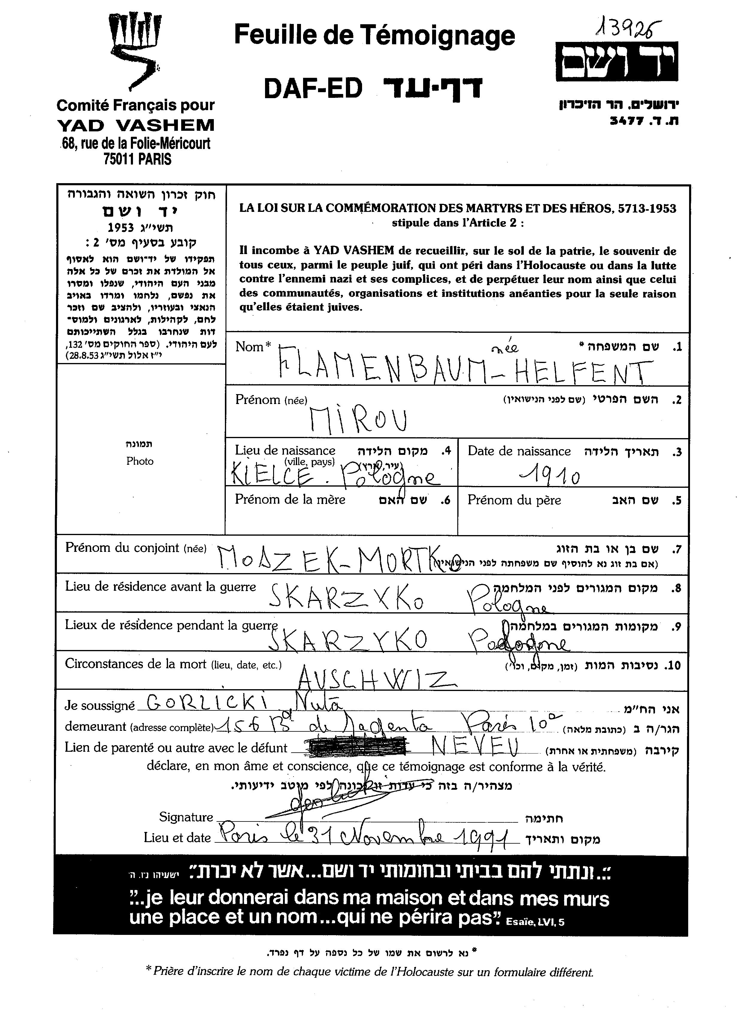 Фламенбаум Миру Миро 1910 Скаржиско-Каменна, Польша Лист свидетельских показаний