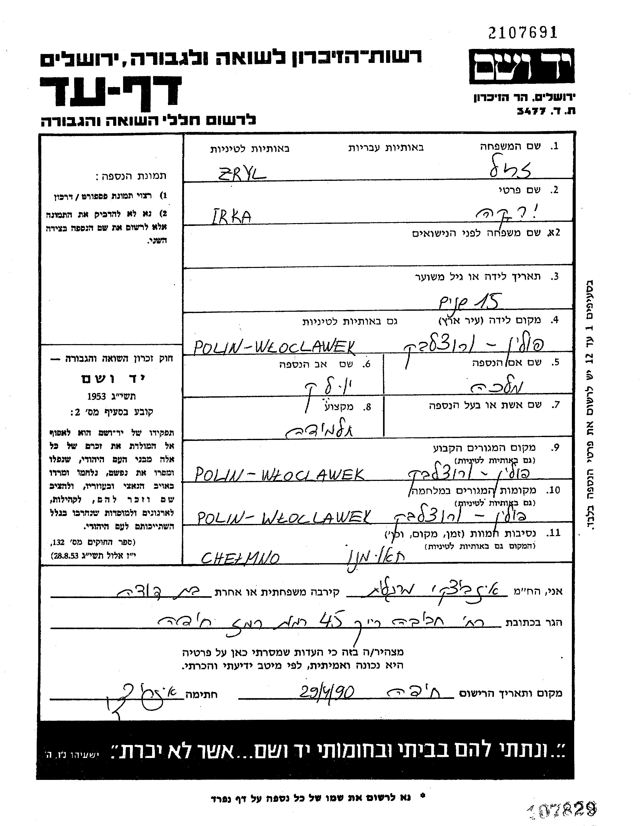 Ирка Ире Зриль, место рождения: Влоцлавек, Польша. Отец: Юлек, mать:Малка. Ученик / ученица. Ребенок. Место жительства до войны: Влоцлавек, Польша. Место во время войны: Влоцлавек, Польша.