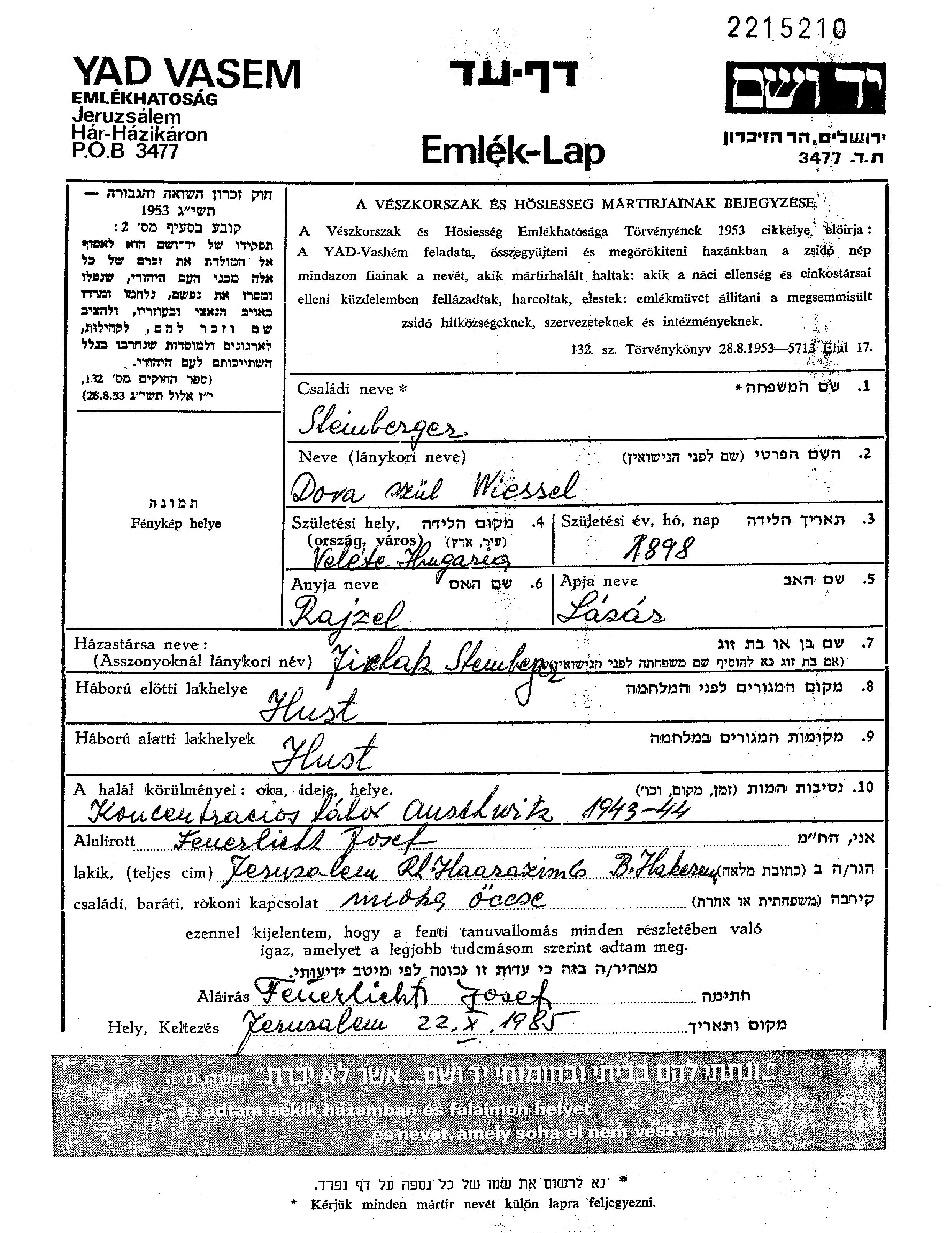 Дора Штайнбергер, девичья фамилия Виссель, место рождения: Велете, Чехословакия. Отец: Лазарь, mать:Райзел. Женат / замужем. Место жительства до войны: Хуст, Чехословакия. Место во время войны: Хуст, Чехословакия.