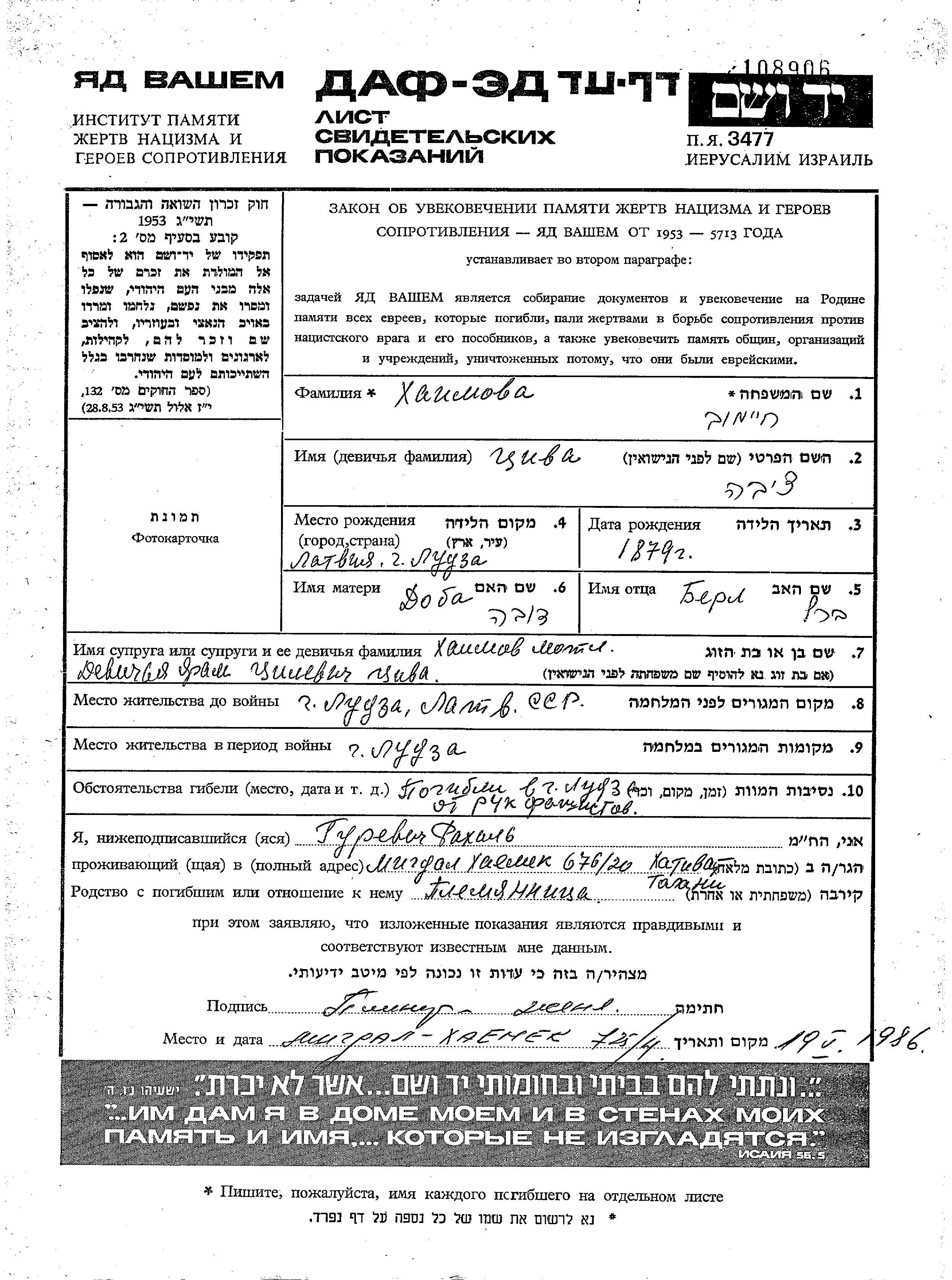 Хаимов Цива 1879 Лудза, Латвия Лист свидетельских показаний