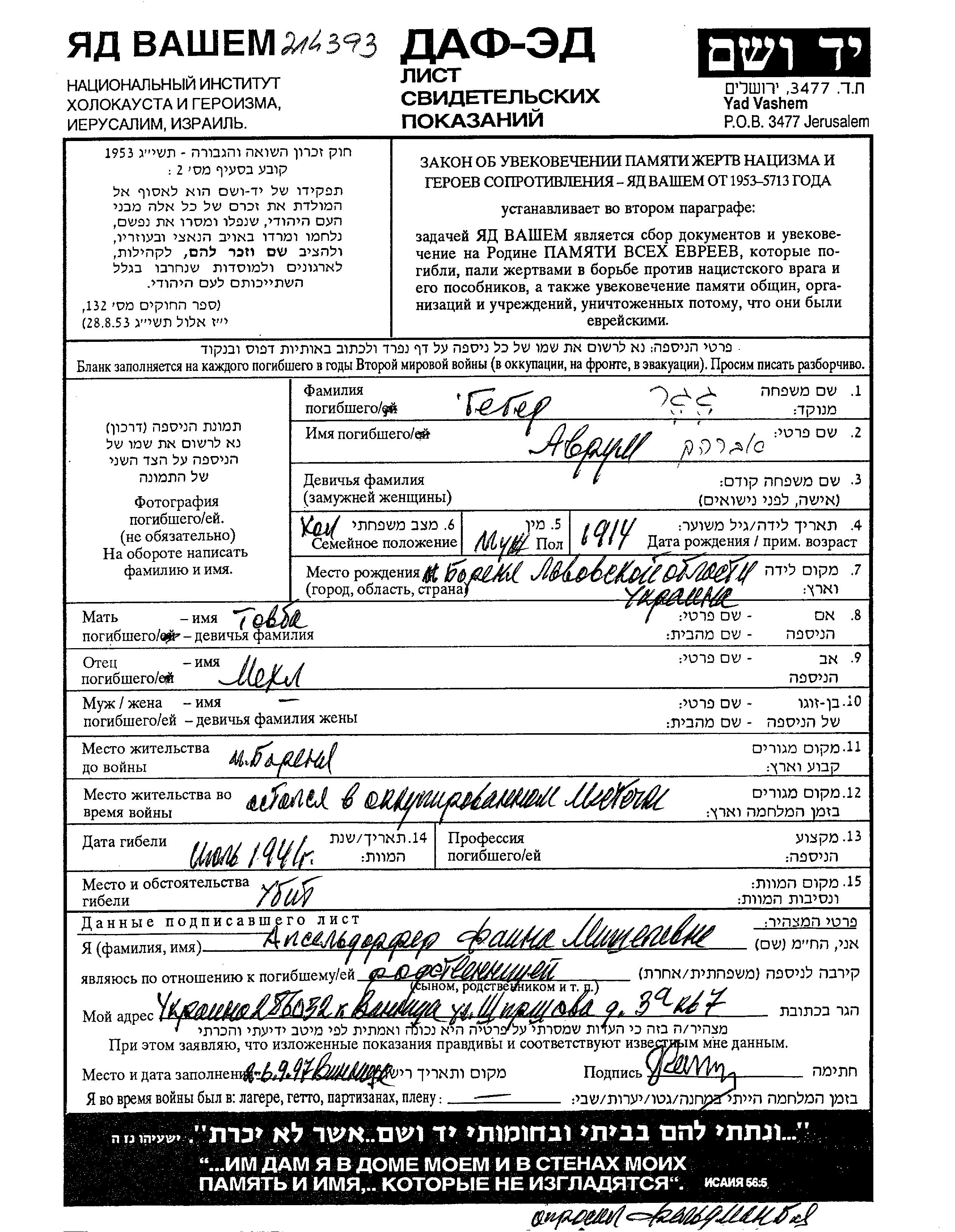 Аврум Гегер, место рождения: Борыня, Польша. Отец: Мехл, mать:Товба. Холост / не замужем. Место жительства до войны: Борыня, Польша. Место во время войны: Борыня, Польша.