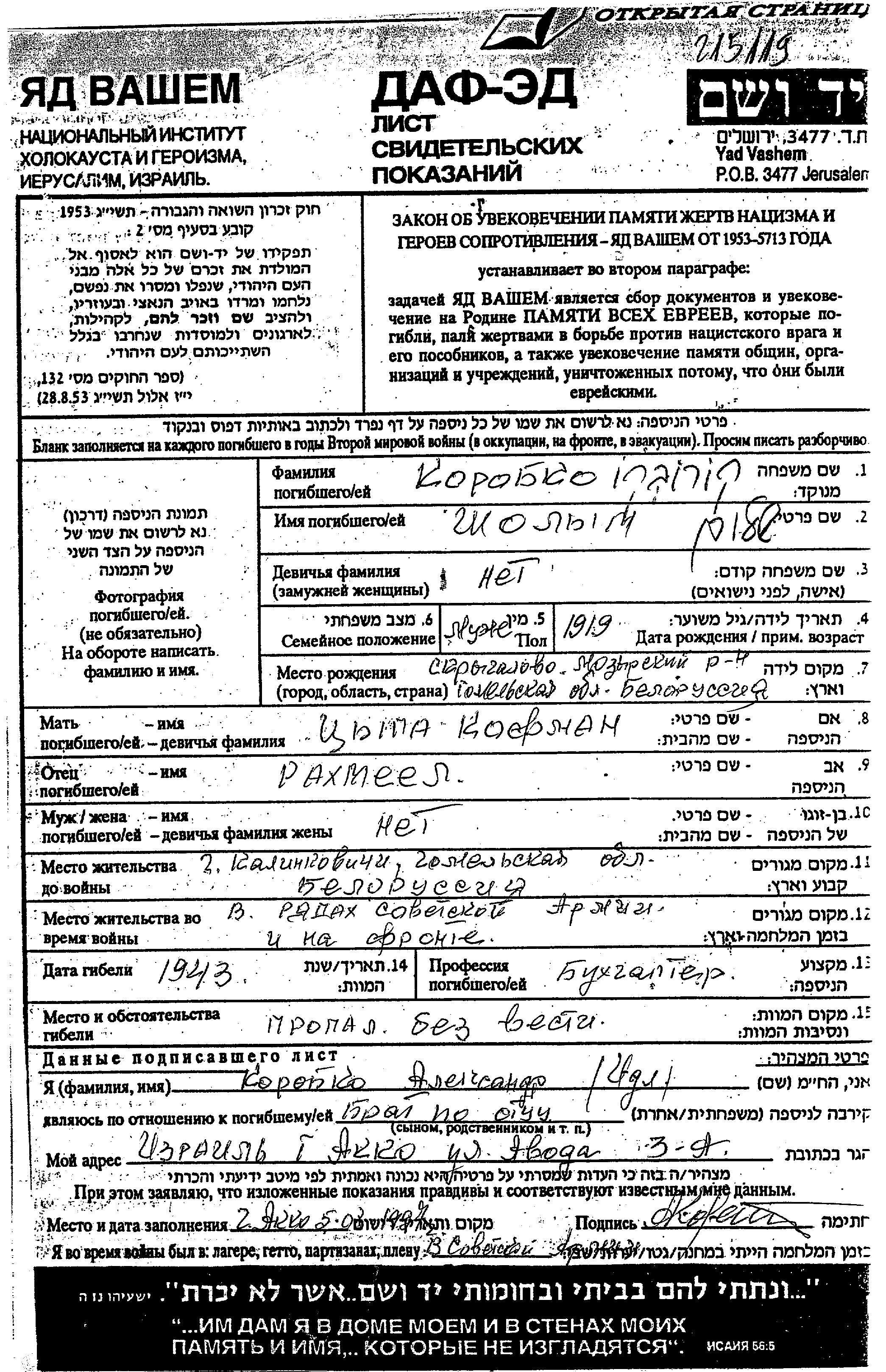 Шолым Коробко, место рождения: Скрыгалов, Белоруссия (СССР). Отец: Рахмеел, mать:Ципа, девичья фамилия Кофман. Бухгалтер / счетовод. Место во время войны: Вооруженные силы Советского Союза. Шолым уничтожен в период Шоа. место смерти: неизвестно в 1943.