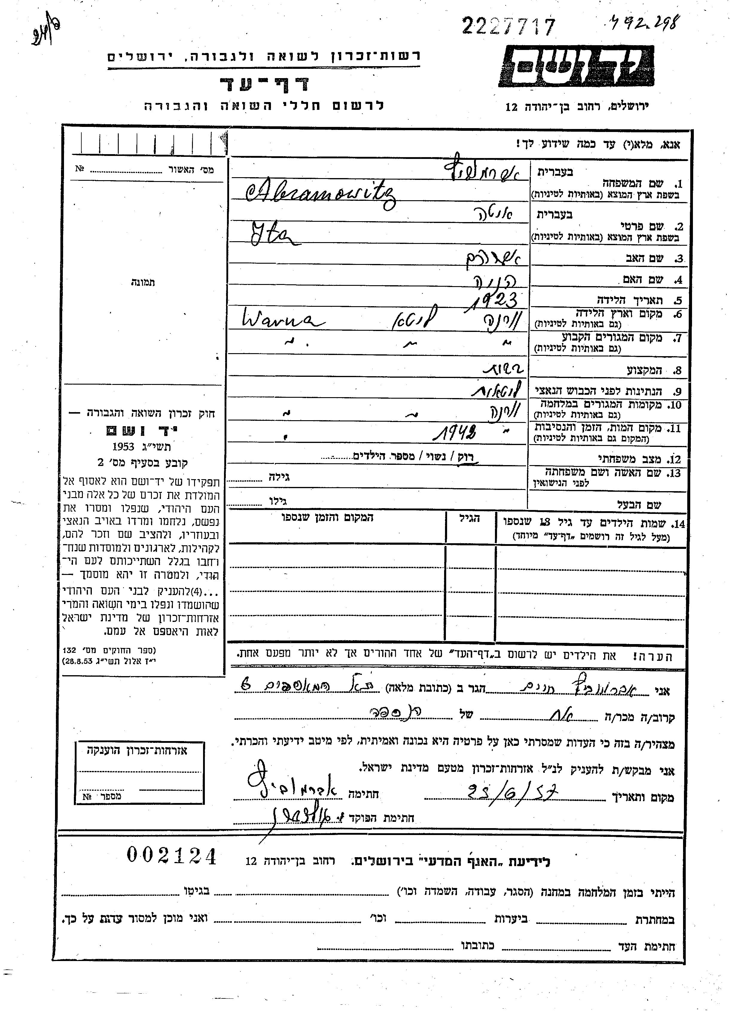 Яд Вашем - Листы свидетельских показаний Мемориального фонда