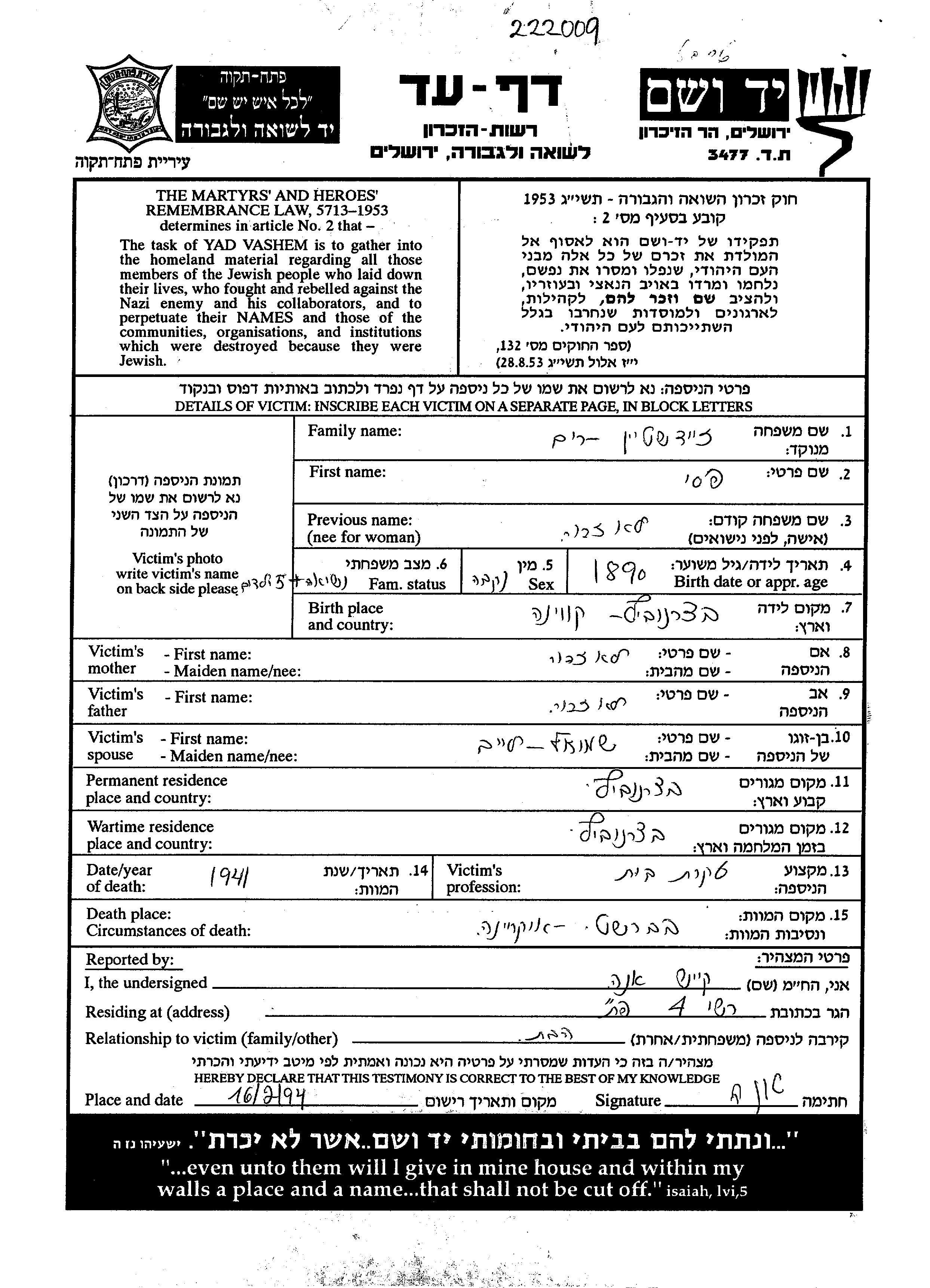 Яд Вашем - Листы свидетельских показаний Мемориального фонда