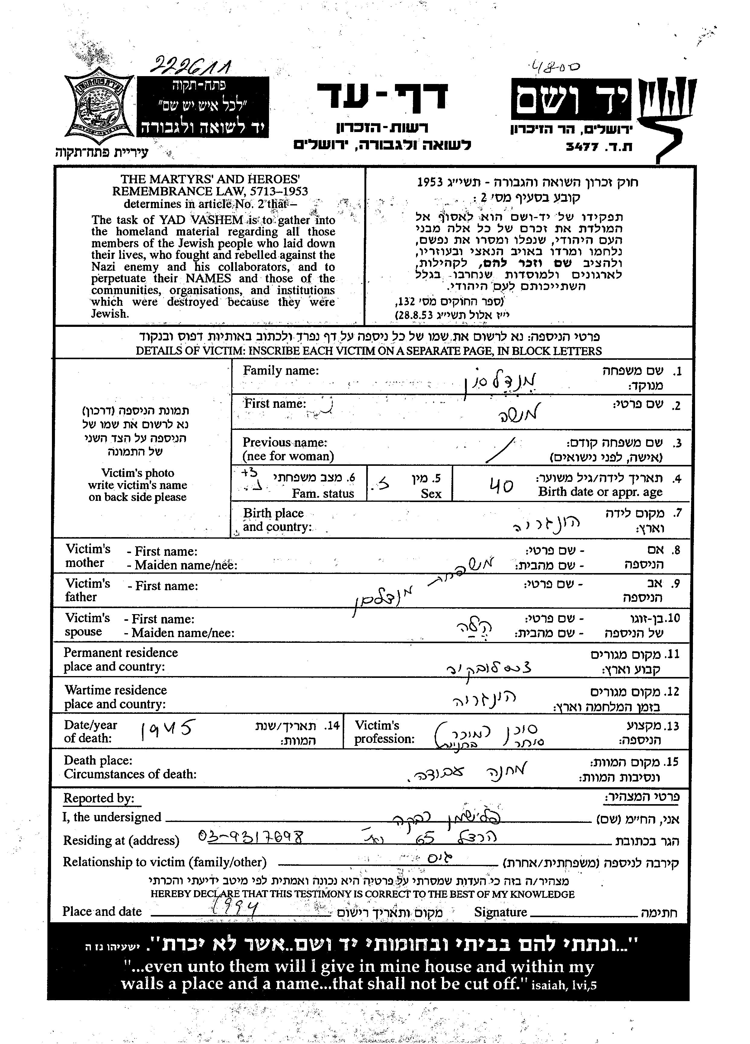 Яд Вашем - Листы свидетельских показаний Мемориального фонда