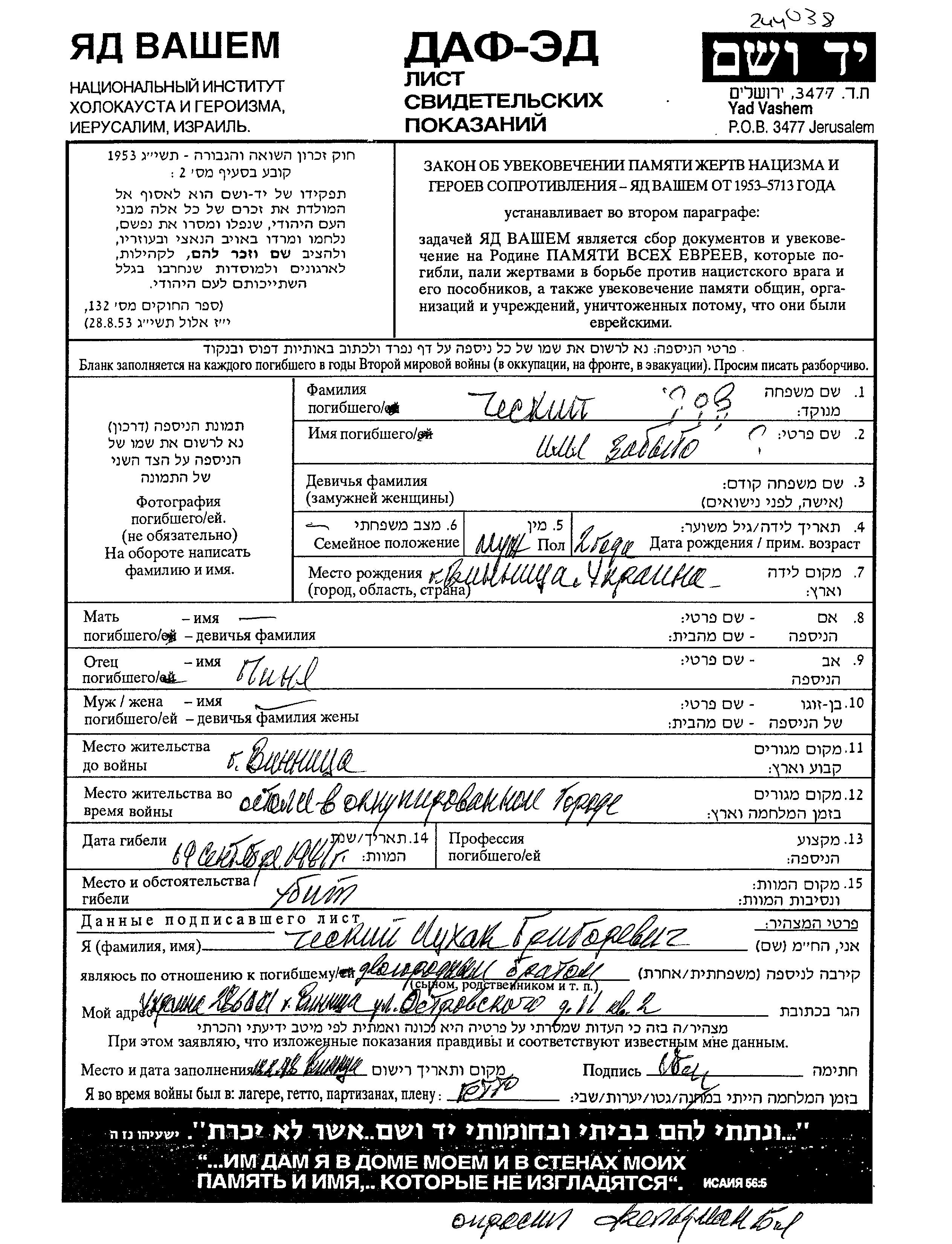 Яд Вашем - Листы свидетельских показаний Мемориального фонда