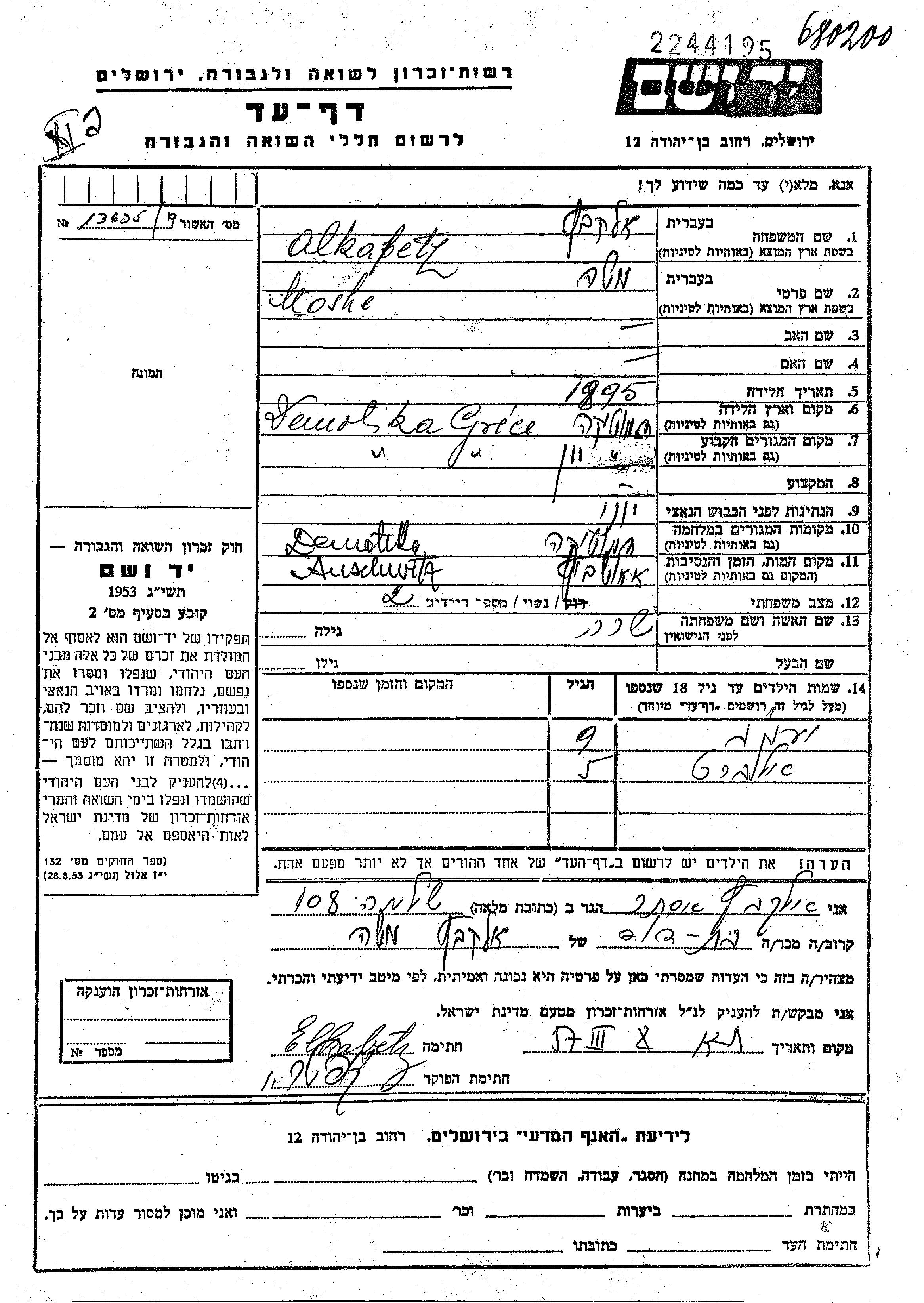 Моше Алькабец, место рождения: Дидимотихон, Греция. Женат / замужем. Место жительства до войны: Дидимотихон, Греция. Место во время войны: Дидимотихон, Греция.