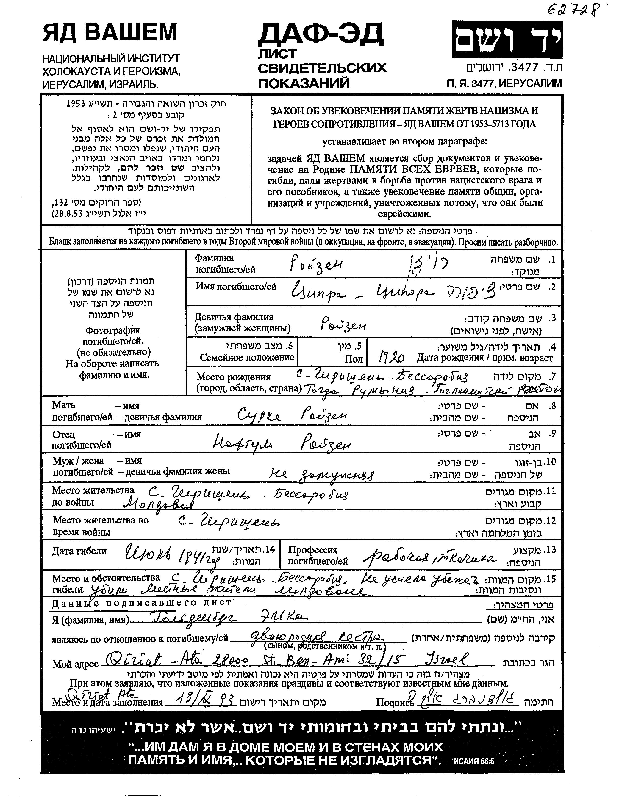 Ципора Ройзен, место рождения: Гиришень, Румыния. Отец: Нафтали, mать:Сурке. Ткач / ткачиха. Холост / не замужем. Место жительства до войны: Гиришень, Румыния. Место во время войны: Гиришень, Румыния.