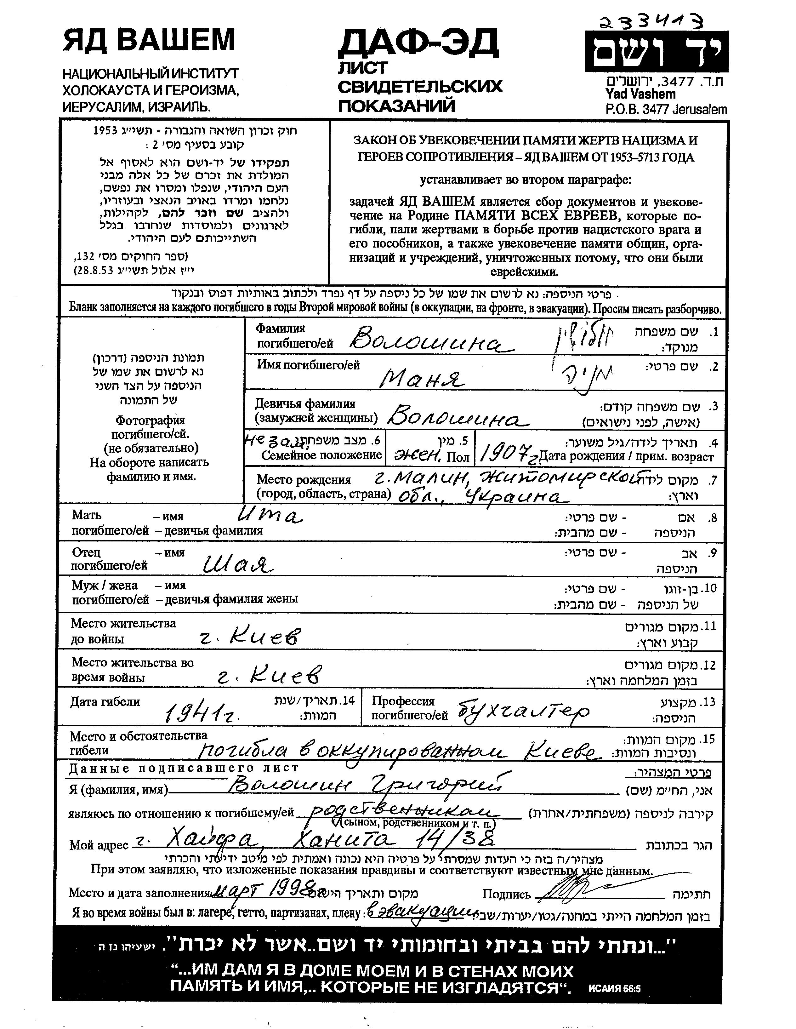 Волошин Маня 1907 Киев, Украина (СССР) Лист свидетельских показаний