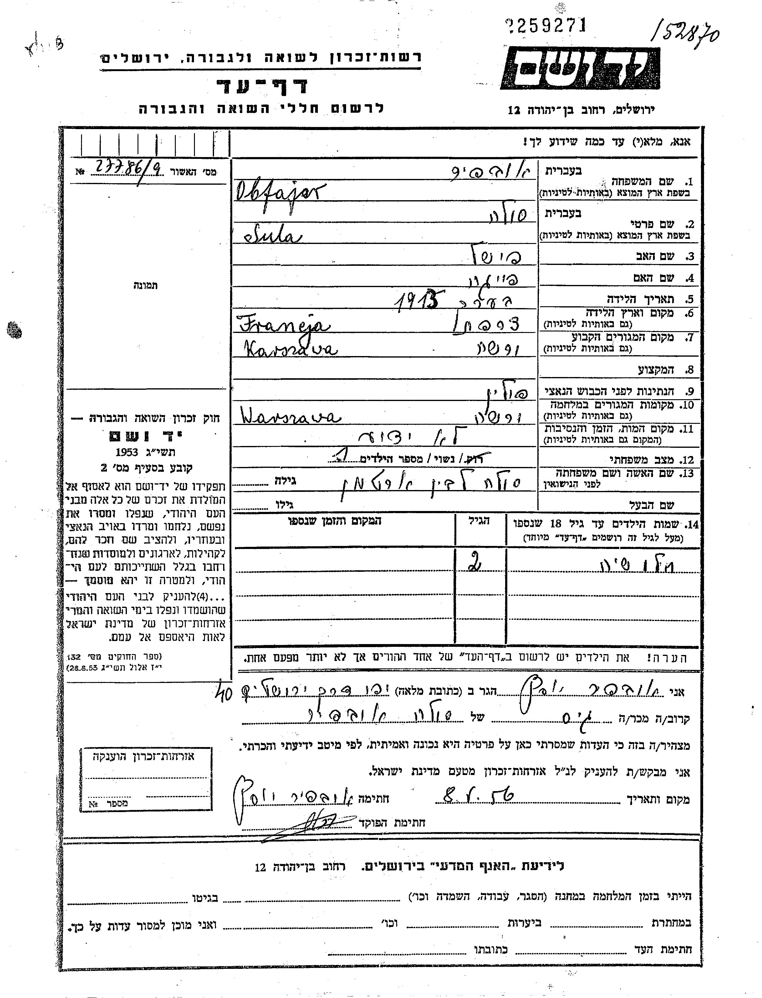 Сула Обфайер, девичья фамилия Артман, место рождения: Франция. Отец: Фишель, mать:Фейга. Женат / замужем. Место жительства до войны: Варшава, Польша. Место во время войны: Варшава, Польша.