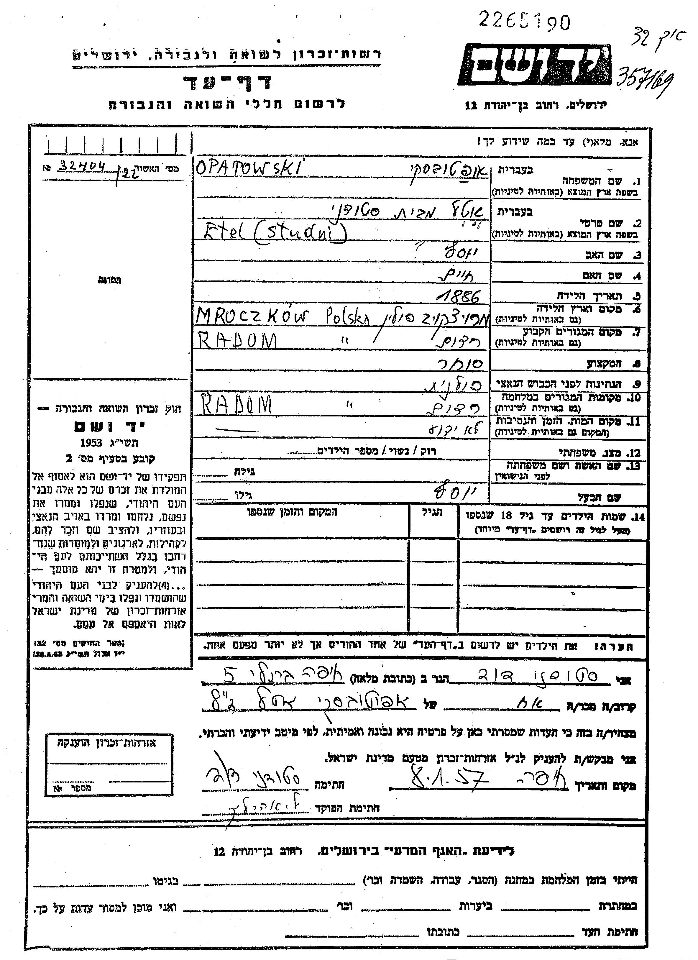 Этель Опатовски, девичья фамилия Студны, место рождения: Мрочкув, Польша. Отец: Хаим. Торговец / торговка. Женат / замужем. Место жительства до войны: Радом, Польша. Место во время войны: Радом, Польша.
