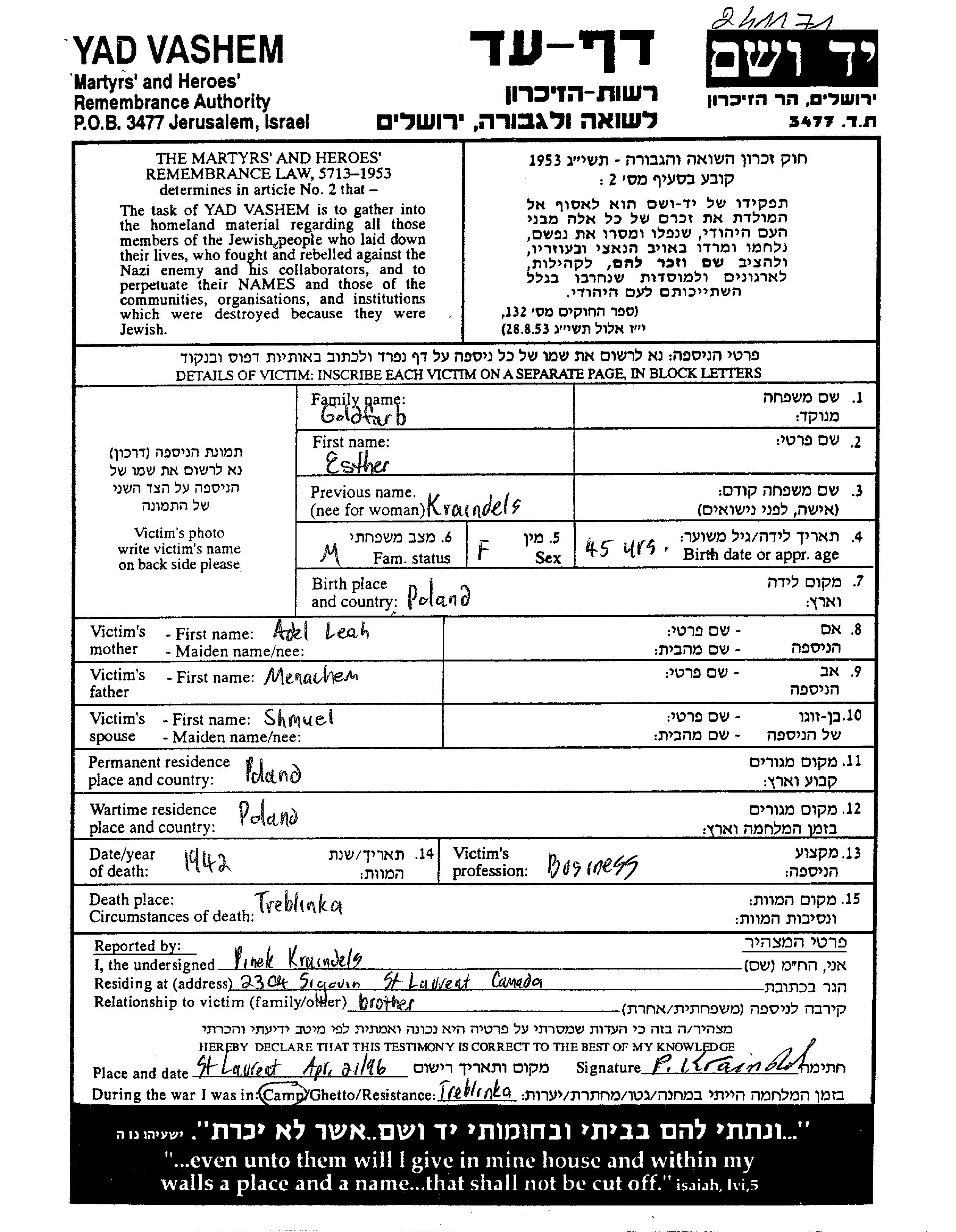 Эстер Гольдфарб, девичья фамилия Крайндельс, место рождения: Польша. Отец: Менахем, mать:Адель Лея Эдел. Предприниматель. Женат / замужем. Место жительства до войны: Польша. Место во время войны: Польша.