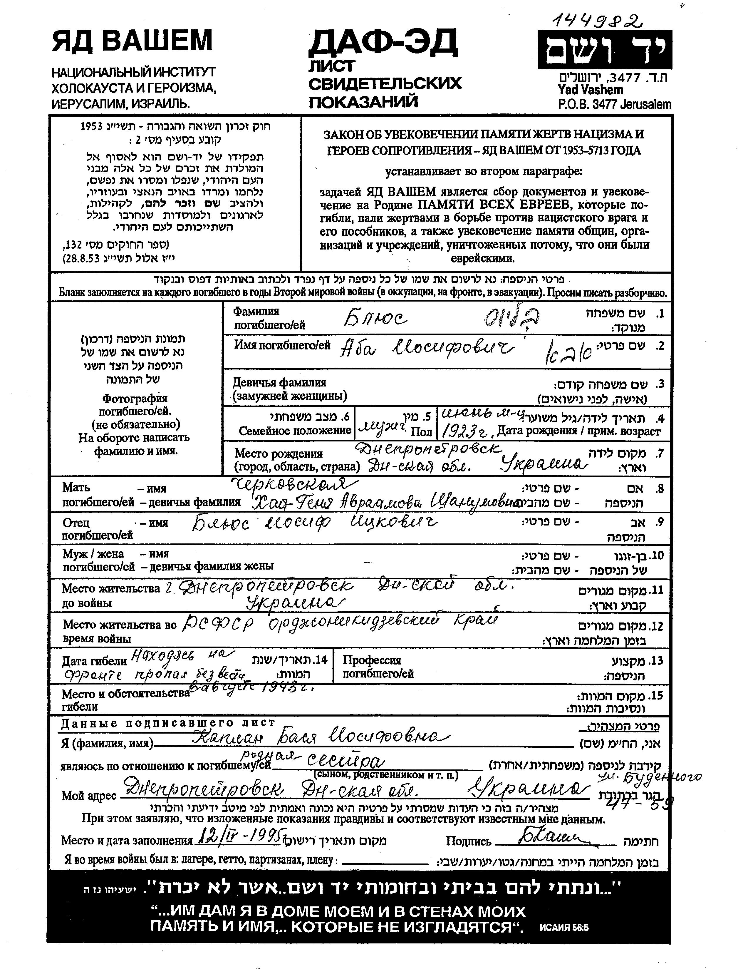 Блюс Блайвайс Аба 1923 Днепропетровск, Украина (СССР) Лист свидетельских показаний